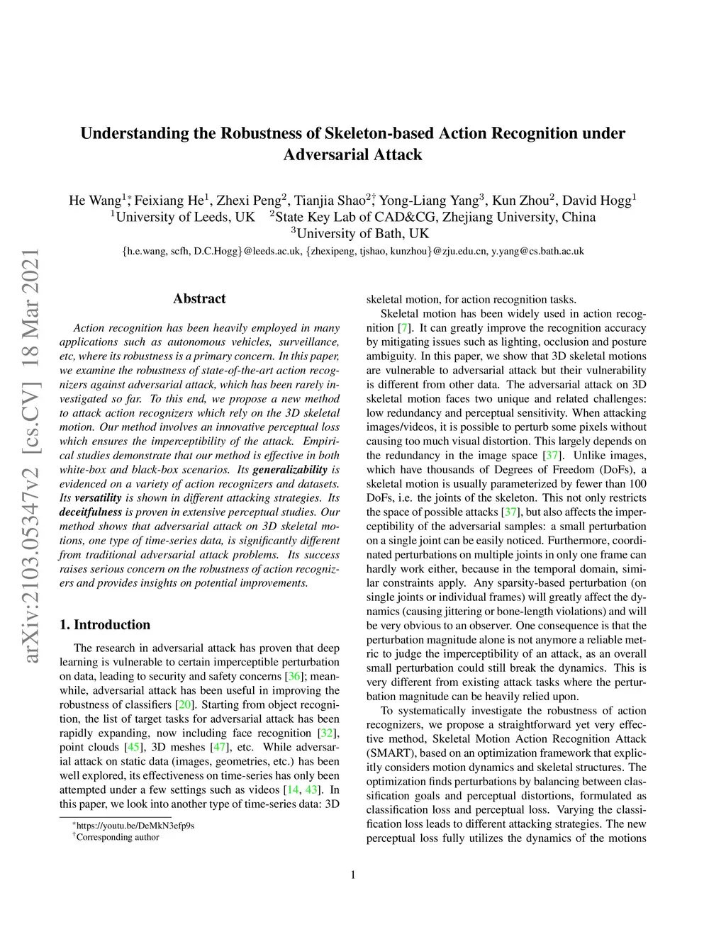 Action recognition has been heavily employed in many applications such as autonomous vehicles, surveillance, etc, where its robustness is a primary concern. In this paper, we examine the robustness of state-of-the-art action recognizers against adversarial attack, which has been rarely investigated so far. To this end, we propose a new method to attack action recognizers that rely on 3D skeletal motion. Our method involves an innovative perceptual loss that ensures the imperceptibility of the attack. Empirical studies demonstrate that our method is effective in both white-box and black-box scenarios. Its generalizability is evidenced on a variety of action recognizers and datasets. Its versatility is shown in different attacking strategies. Its deceitfulness is proven in extensive perceptual studies. Our method shows that adversarial attack on 3D skeletal motions, one type of time-series data, is significantly different from traditional adversarial attack problems. Its success raises serious concern on the robustness of action recognizers and provides insights on potential improvements.