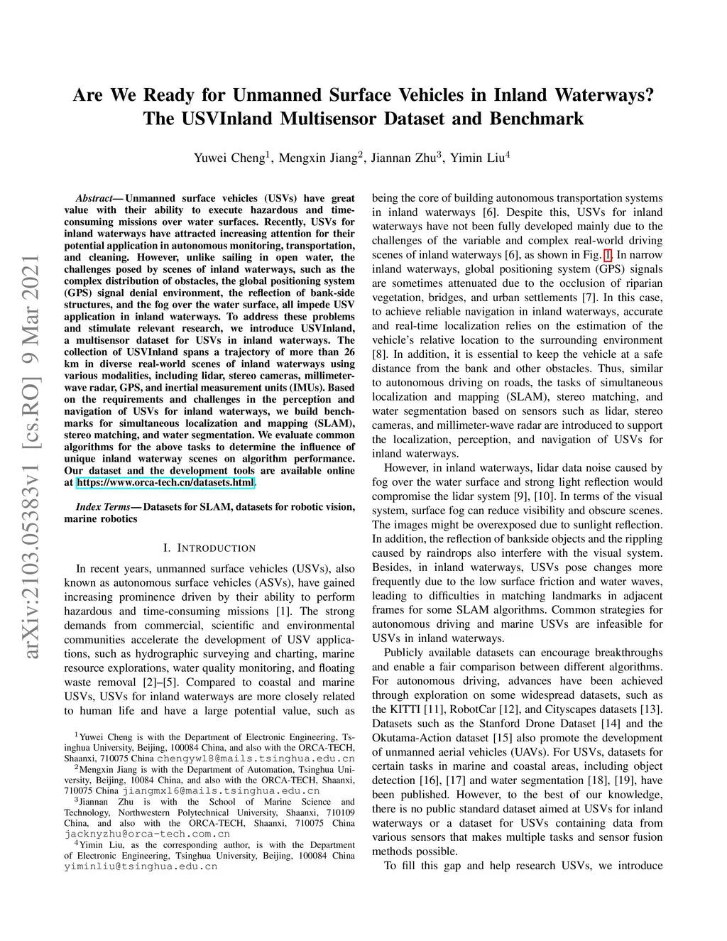 Unmanned surface vehicles (USVs) have great value with their ability to execute hazardous and time-consuming missions over water surfaces. Recently, USVs for inland waterways have attracted increasing attention for their potential application in autonomous monitoring, transportation, and cleaning. However, unlike sailing in open water, the challenges posed by scenes of inland waterways, such as the complex distribution of obstacles, the global positioning system (GPS) signal denial environment, the reflection of bank-side structures, and the fog over the water surface, all impede USV application in inland waterways. To address these problems and stimulate relevant research, we introduce USVInland, a multisensor dataset for USVs in inland waterways. The collection of USVInland spans a trajectory of more than 26 km in diverse real-world scenes of inland waterways using various modalities, including lidar, stereo cameras, millimeter-wave radar, GPS, and inertial measurement units (IMUs). Based on the requirements and challenges in the perception and navigation of USVs for inland waterways, we build benchmarks for simultaneous localization and mapping (SLAM), stereo matching, and water segmentation. We evaluate common algorithms for the above tasks to determine the influence of unique inland waterway scenes on algorithm performance. Our dataset and the development tools are available online at https://www.orca-tech.cn/datasets.html.
