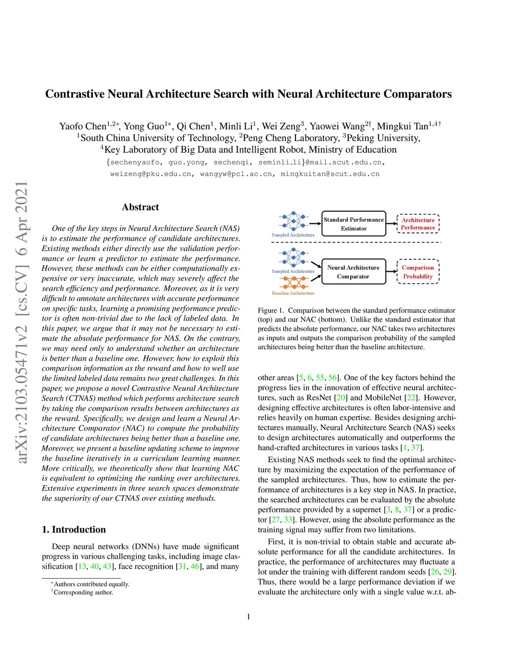 One of the key steps in Neural Architecture Search (NAS) is to estimate the performance of candidate architectures. Existing methods either directly use the validation performance or learn a predictor to estimate the performance. However, these methods can be either computationally expensive or very inaccurate, which may severely affect the search efficiency and performance. Moreover, as it is very difficult to annotate architectures with accurate performance on specific tasks, learning a promising performance predictor is often non-trivial due to the lack of labeled data. In this paper, we argue that it may not be necessary to estimate the absolute performance for NAS. On the contrary, we may need only to understand whether an architecture is better than a baseline one. However, how to exploit this comparison information as the reward and how to well use the limited labeled data remains two great challenges. In this paper, we propose a novel Contrastive Neural Architecture Search (CTNAS) method which performs architecture search by taking the comparison results between architectures as the reward. Specifically, we design and learn a Neural Architecture Comparator (NAC) to compute the probability of candidate architectures being better than a baseline one. Moreover, we present a baseline updating scheme to improve the baseline iteratively in a curriculum learning manner. More critically, we theoretically show that learning NAC is equivalent to optimizing the ranking over architectures. Extensive experiments in three search spaces demonstrate the superiority of our CTNAS over existing methods.