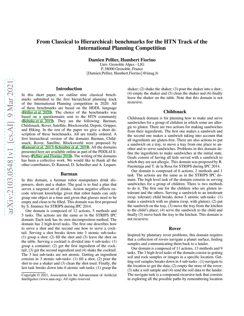 In this short paper, we outline nine classical benchmarks submitted to the first hierarchical planning track of the International Planning competition in 2020. All of these benchmarks are based on the HDDL language. The choice of the benchmarks was based on a questionnaire sent to the HTN community. They are the following: Barman, Childsnack, Rover, Satellite, Blocksworld, Depots, Gripper, and Hiking. In the rest of the paper we give a short description of these benchmarks. All are totally ordered.