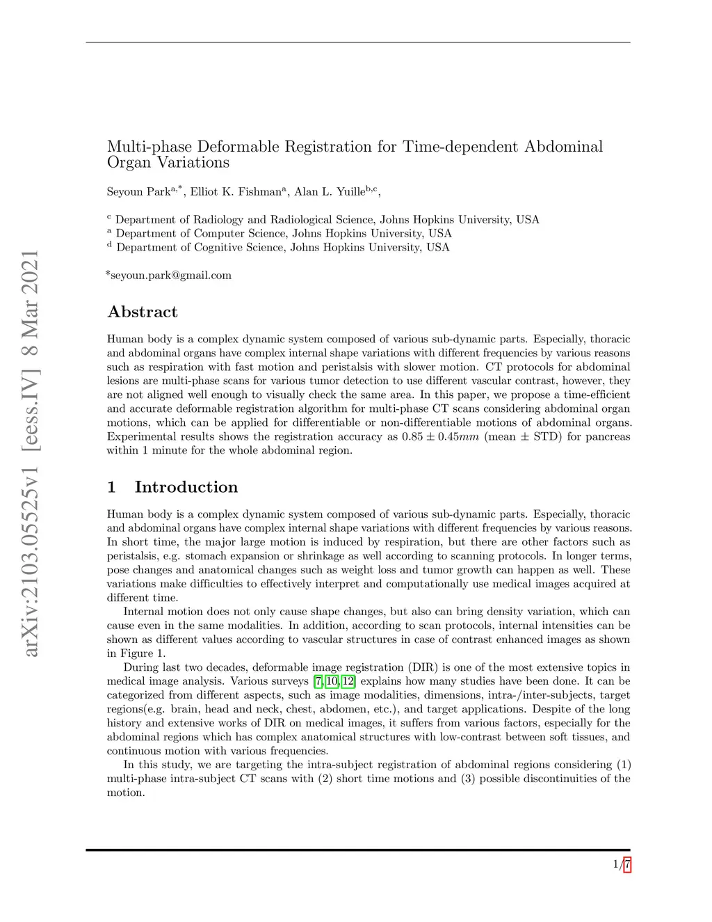 Human body is a complex dynamic system composed of various sub-dynamic parts. Especially, thoracic and abdominal organs have complex internal shape variations with different frequencies by various reasons such as respiration with fast motion and peristalsis with slower motion. CT protocols for abdominal lesions are multi-phase scans for various tumor detection to use different vascular contrast, however, they are not aligned well enough to visually check the same area. In this paper, we propose a time-efficient and accurate deformable registration algorithm for multi-phase CT scans considering abdominal organ motions, which can be applied for differentiable or non-differentiable motions of abdominal organs. Experimental results shows the registration accuracy as 0.85 +/- 0.45mm (mean +/- STD) for pancreas within 1 minute for the whole abdominal region.