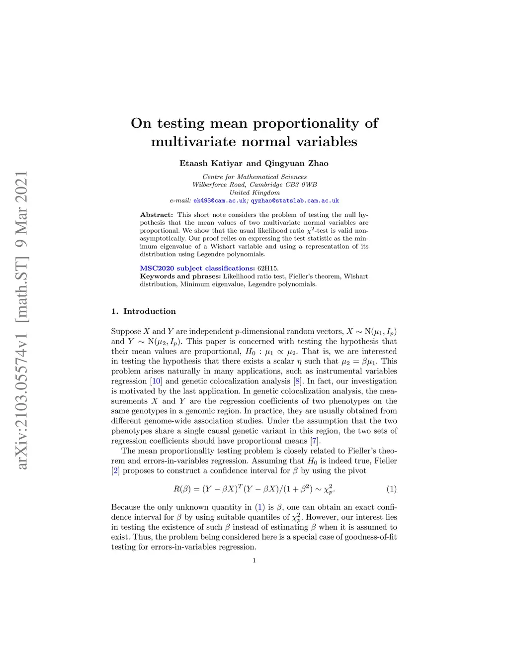 This short note considers the problem of testing the null hypothesis that the mean values of two multivariate normal variables are proportional. We show that the usual likelihood ratio -test is valid non-asymptotically. Our proof relies on expressing the test statistic as the minimum eigenvalue of a Wishart variable and using a representation of its distribution using Legendre polynomials.
