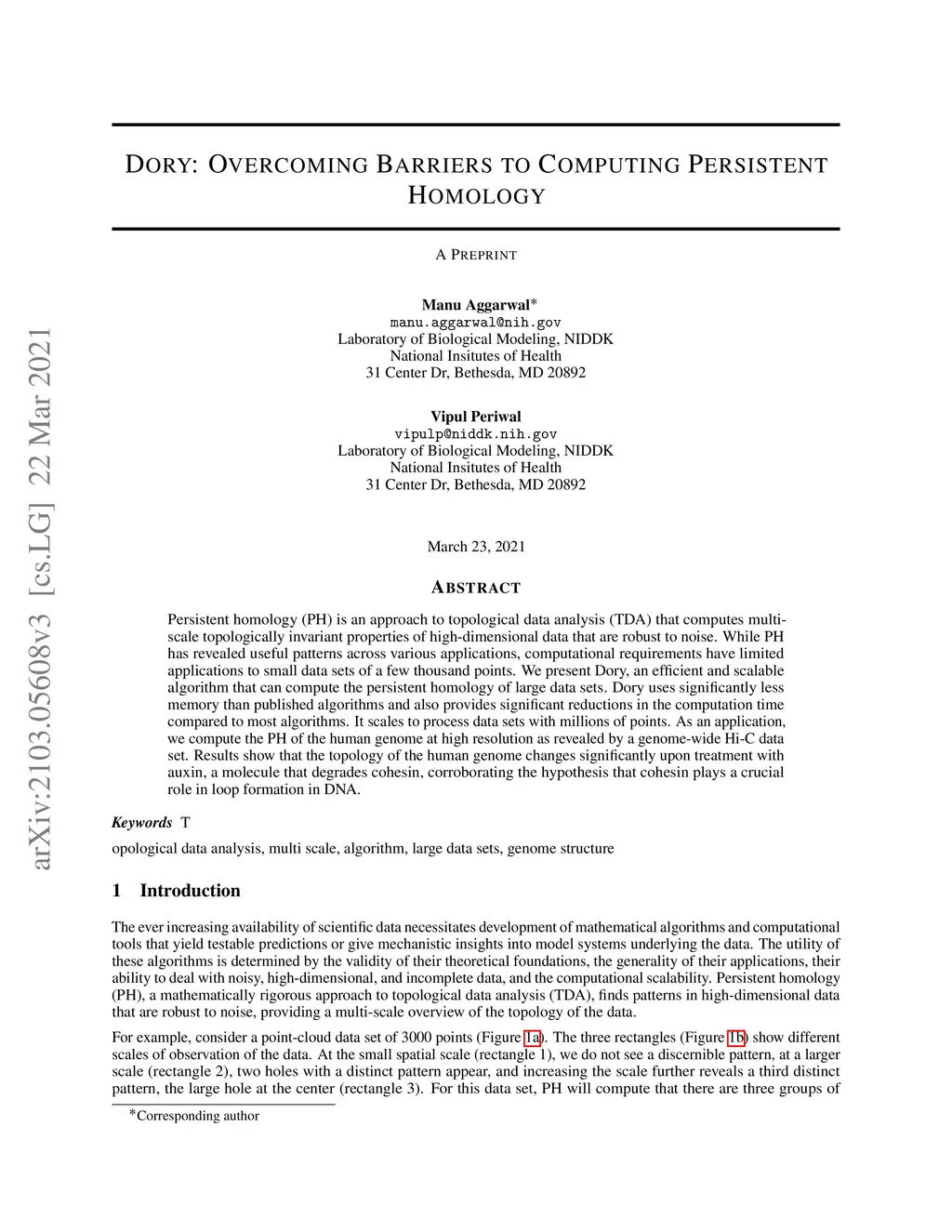 Persistent homology (PH) is an approach to topological data analysis (TDA) that computes multi-scale topologically invariant properties of high-dimensional data that are robust to noise. While PH has revealed useful patterns across various applications, computational requirements have limited applications to small data sets of a few thousand points. We present Dory, an efficient and scalable algorithm that can compute the persistent homology of large data sets. Dory uses significantly less memory than published algorithms and also provides significant reductions in the computation time compared to most algorithms. It scales to process data sets with millions of points. As an application, we compute the PH of the human genome at high resolution as revealed by a genome-wide Hi-C data set. Results show that the topology of the human genome changes significantly upon treatment with auxin, a molecule that degrades cohesin, corroborating the hypothesis that cohesin plays a crucial role in loop formation in DNA.