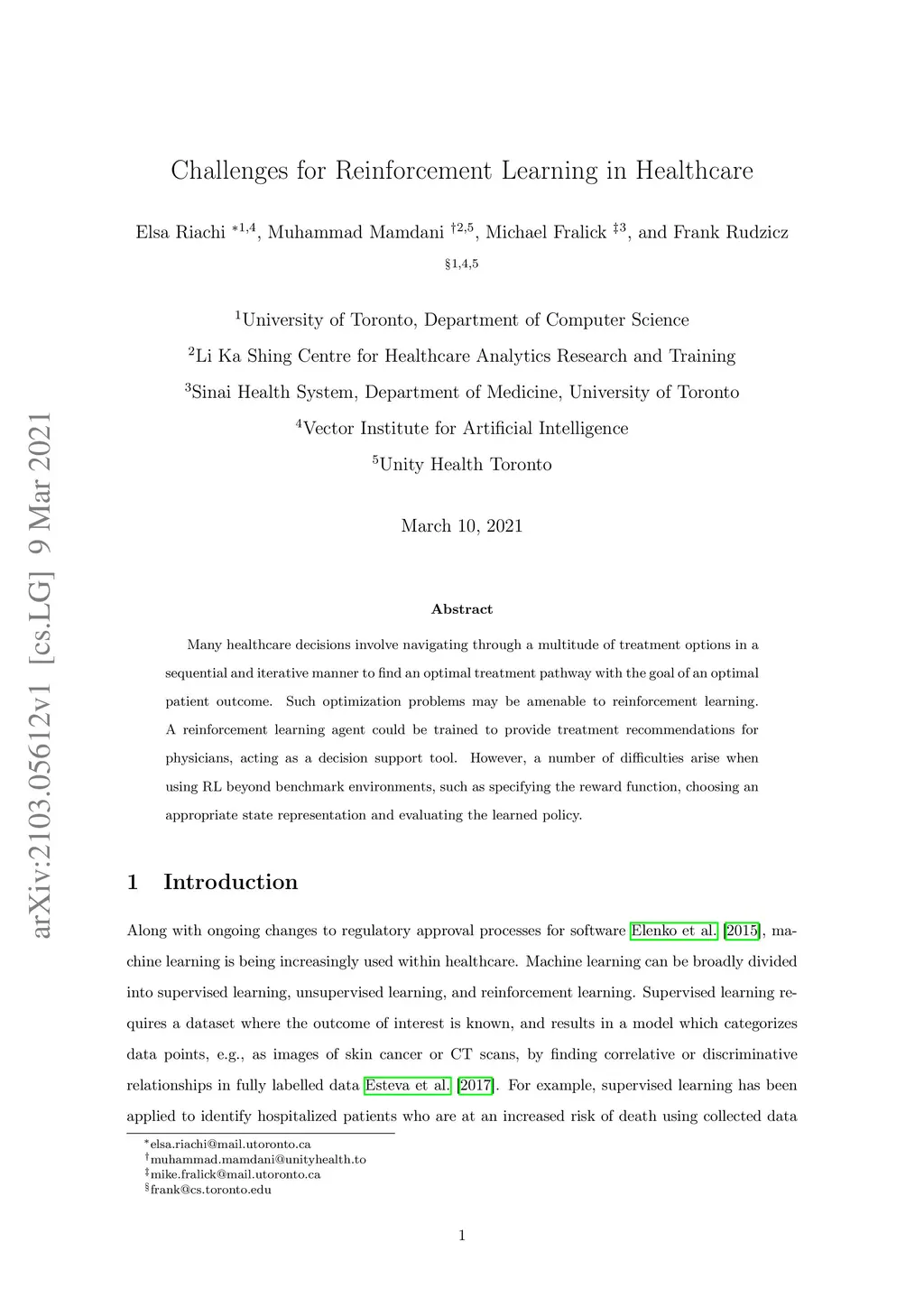 Many healthcare decisions involve navigating through a multitude of treatment options in a sequential and iterative manner to find an optimal treatment pathway with the goal of an optimal patient outcome. Such optimization problems may be amenable to reinforcement learning. A reinforcement learning agent could be trained to provide treatment recommendations for physicians, acting as a decision support tool. However, a number of difficulties arise when using RL beyond benchmark environments, such as specifying the reward function, choosing an appropriate state representation and evaluating the learned policy.