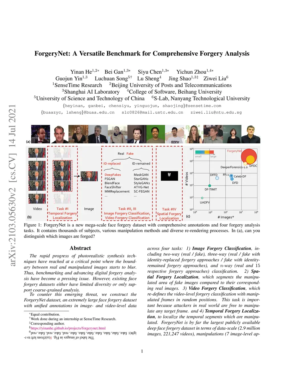 The rapid progress of photorealistic synthesis techniques has reached at a critical point where the boundary between real and manipulated images starts to blur. Thus, benchmarking and advancing digital forgery analysis have become a pressing issue. However, existing face forgery datasets either have limited diversity or only support coarse-grained analysis. To counter this emerging threat, we construct the ForgeryNet dataset, an extremely large face forgery dataset with unified annotations in image- and video-level data across four tasks: 1) Image Forgery Classification, including two-way (real / fake), three-way (real / fake with identity-replaced forgery approaches / fake with identity-remained forgery approaches), and n-way (real and 15 respective forgery approaches) classification. 2) Spatial Forgery Localization, which segments the manipulated area of fake images compared to their corresponding source real images. 3) Video Forgery Classification, which re-defines the video-level forgery classification with manipulated frames in random positions. This task is important because attackers in real world are free to manipulate any target frame. and 4) Temporal Forgery Localization, to localize the temporal segments which are manipulated. ForgeryNet is by far the largest publicly available deep face forgery dataset in terms of data-scale (2.9 million images, 221,247 videos), manipulations (7 image-level approaches, 8 video-level approaches), perturbations (36 independent and more mixed perturbations) and annotations (6.3 million classification labels, 2.9 million manipulated area annotations and 221,247 temporal forgery segment labels). We perform extensive benchmarking and studies of existing face forensics methods and obtain several valuable observations.