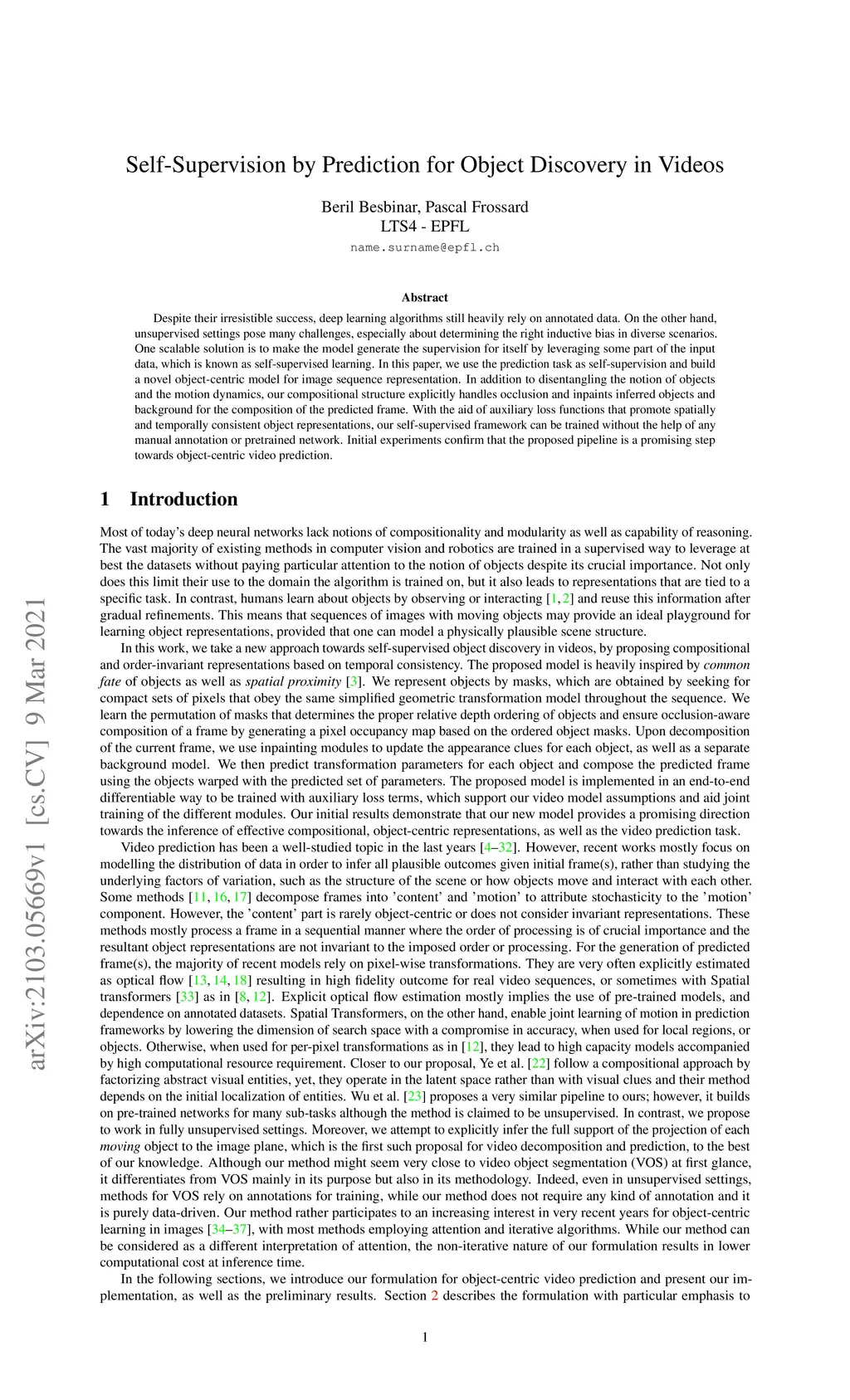 Despite their irresistible success, deep learning algorithms still heavily rely on annotated data. On the other hand, unsupervised settings pose many challenges, especially about determining the right inductive bias in diverse scenarios. One scalable solution is to make the model generate the supervision for itself by leveraging some part of the input data, which is known as self-supervised learning. In this paper, we use the prediction task as self-supervision and build a novel object-centric model for image sequence representation. In addition to disentangling the notion of objects and the motion dynamics, our compositional structure explicitly handles occlusion and inpaints inferred objects and background for the composition of the predicted frame. With the aid of auxiliary loss functions that promote spatially and temporally consistent object representations, our self-supervised framework can be trained without the help of any manual annotation or pretrained network. Initial experiments confirm that the proposed pipeline is a promising step towards object-centric video prediction.
