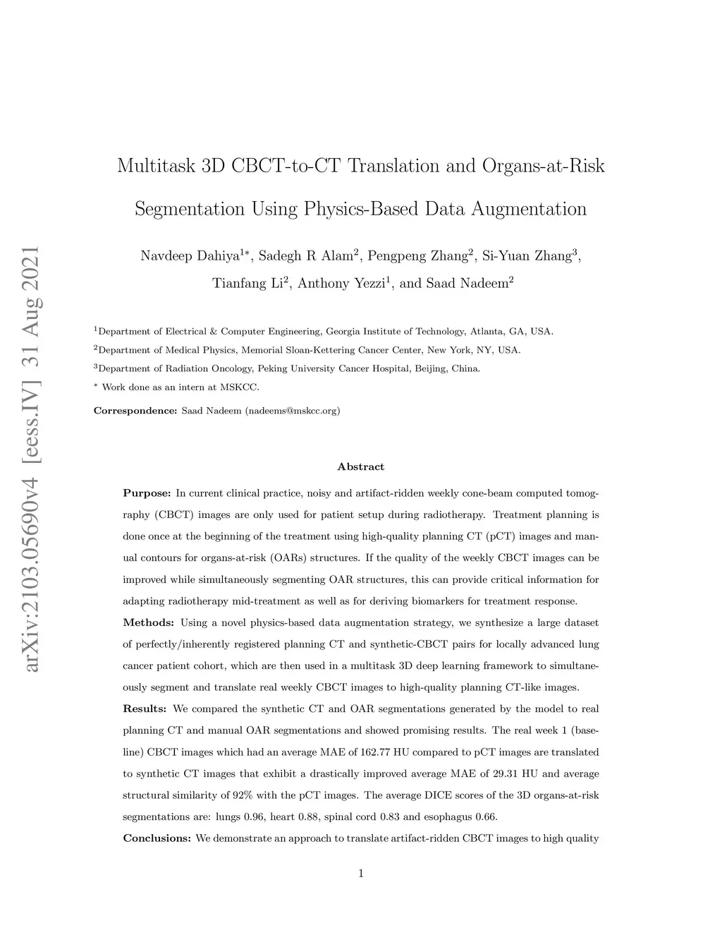 In current clinical practice, noisy and artifact-ridden weekly cone-beam computed tomography (CBCT) images are only used for patient setup during radiotherapy. Treatment planning is done once at the beginning of the treatment using high-quality planning CT (pCT) images and manual contours for organs-at-risk (OARs) structures. If the quality of the weekly CBCT images can be improved while simultaneously segmenting OAR structures, this can provide critical information for adapting radiotherapy mid-treatment as well as for deriving biomarkers for treatment response. Using a novel physics-based data augmentation strategy, we synthesize a large dataset of perfectly/inherently registered planning CT and synthetic-CBCT pairs for locally advanced lung cancer patient cohort, which are then used in a multitask 3D deep learning framework to simultaneously segment and translate real weekly CBCT images to high-quality planning CT-like images. We compared the synthetic CT and OAR segmentations generated by the model to real planning CT and manual OAR segmentations and showed promising results. The real week 1 (baseline) CBCT images which had an average MAE of 162.77 HU compared to pCT images are translated to synthetic CT images that exhibit a drastically improved average MAE of 29.31 HU and average structural similarity of 92% with the pCT images. The average DICE scores of the 3D organs-at-risk segmentations are: lungs 0.96, heart 0.88, spinal cord 0.83 and esophagus 0.66. This approach could allow clinicians to adjust treatment plans using only the routine low-quality CBCT images, potentially improving patient outcomes. Our code, data, and pre-trained models will be made available via our physics-based data augmentation library, Physics-ArX, at https://github.com/nadeemlab/Physics-ArX.