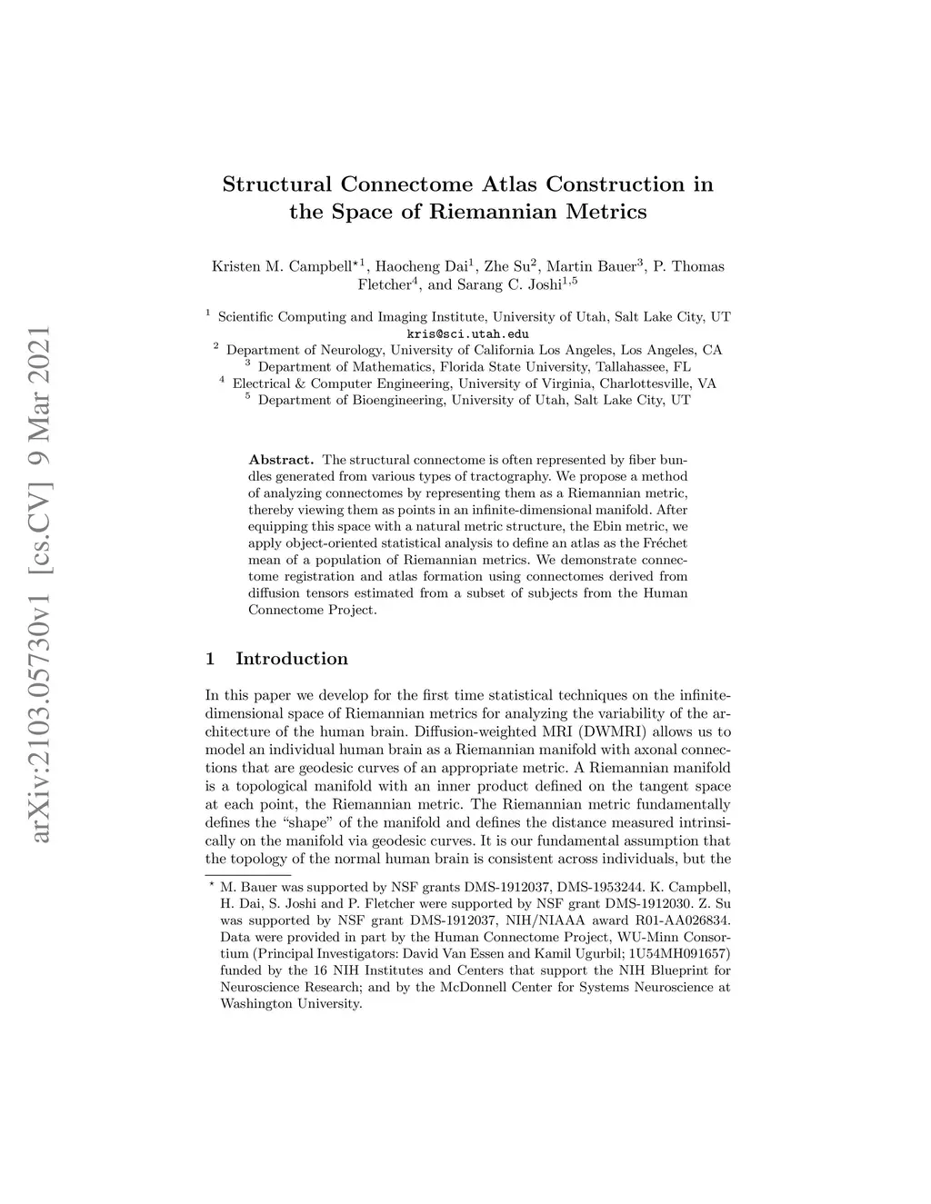 The structural connectome is often represented by fiber bundles generated from various types of tractography. We propose a method of analyzing connectomes by representing them as a Riemannian metric, thereby viewing them as points in an infinite-dimensional manifold. After equipping this space with a natural metric structure, the Ebin metric, we apply object-oriented statistical analysis to define an atlas as the Fr\échet mean of a population of Riemannian metrics. We demonstrate connectome registration and atlas formation using connectomes derived from diffusion tensors estimated from a subset of subjects from the Human Connectome Project.
