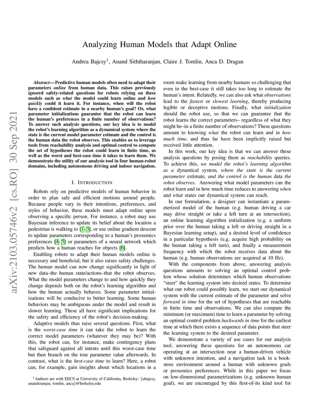 Predictive human models often need to adapt their parameters online from human data. This raises previously ignored safety-related questions for robots relying on these models such as what the model could learn online and how quickly could it learn it. For instance, when will the robot have a confident estimate in a nearby human's goal? Or, what parameter initializations guarantee that the robot can learn the human's preferences in a finite number of observations? To answer such analysis questions, our key idea is to model the robot's learning algorithm as a dynamical system where the state is the current model parameter estimate and the control is the human data the robot observes. This enables us to leverage tools from reachability analysis and optimal control to compute the set of hypotheses the robot could learn in finite time, as well as the worst and best-case time it takes to learn them. We demonstrate the utility of our analysis tool in four human-robot domains, including autonomous driving and indoor navigation.