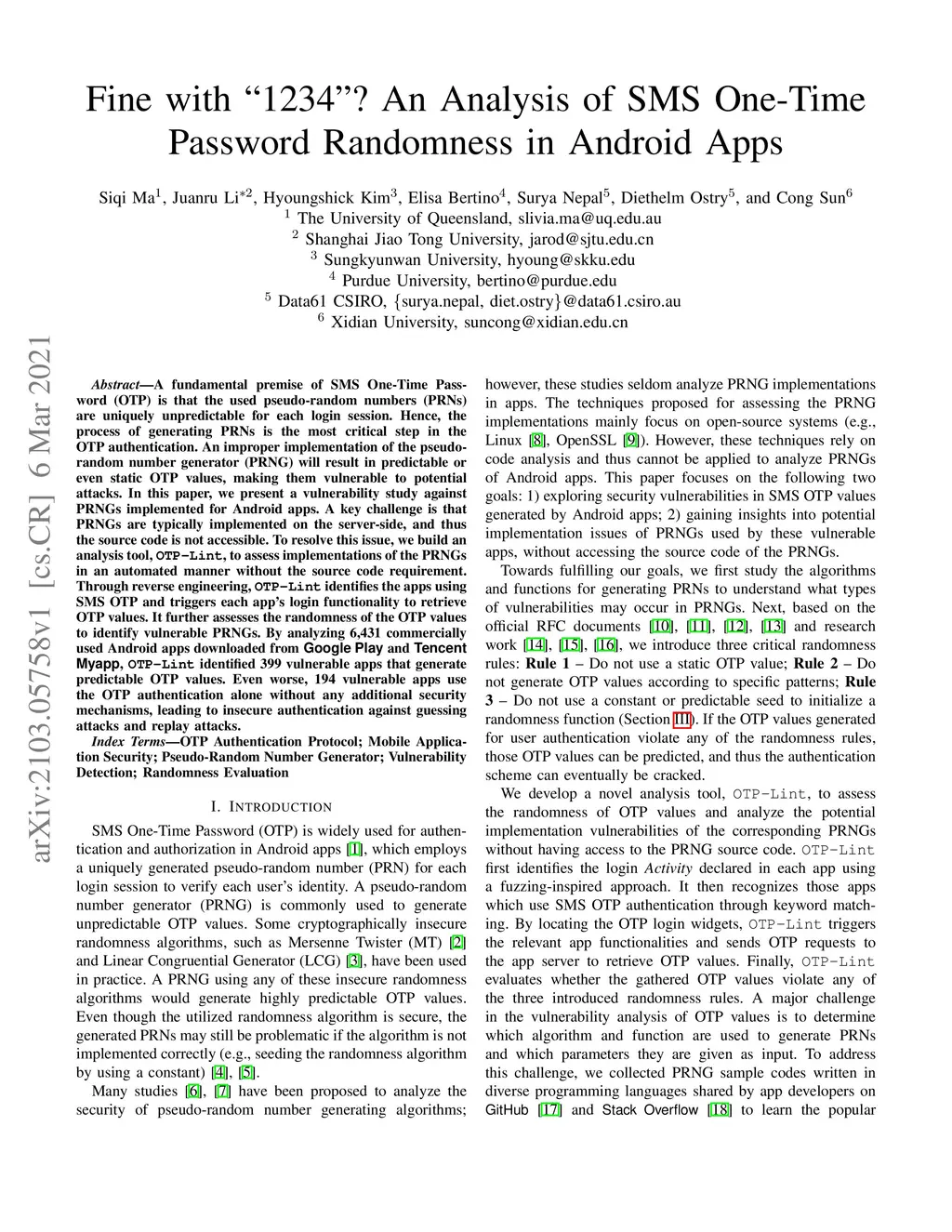 A fundamental premise of SMS One-Time Password (OTP) is that the used pseudo-random numbers (PRNs) are uniquely unpredictable for each login session. Hence, the process of generating PRNs is the most critical step in the OTP authentication. An improper implementation of the pseudo-random number generator (PRNG) will result in predictable or even static OTP values, making them vulnerable to potential attacks. In this paper, we present a vulnerability study against PRNGs implemented for Android apps. A key challenge is that PRNGs are typically implemented on the server-side, and thus the source code is not accessible. To resolve this issue, we build an analysis tool, \sysname, to assess implementations of the PRNGs in an automated manner without the source code requirement. Through reverse engineering, \sysname identifies the apps using SMS OTP and triggers each app's login functionality to retrieve OTP values. It further assesses the randomness of the OTP values to identify vulnerable PRNGs. By analyzing 6,431 commercially used Android apps downloaded from \tool{Google Play} and \tool{Tencent Myapp}, \sysname identified 399 vulnerable apps that generate predictable OTP values. Even worse, 194 vulnerable apps use the OTP authentication alone without any additional security mechanisms, leading to insecure authentication against guessing attacks and replay attacks.