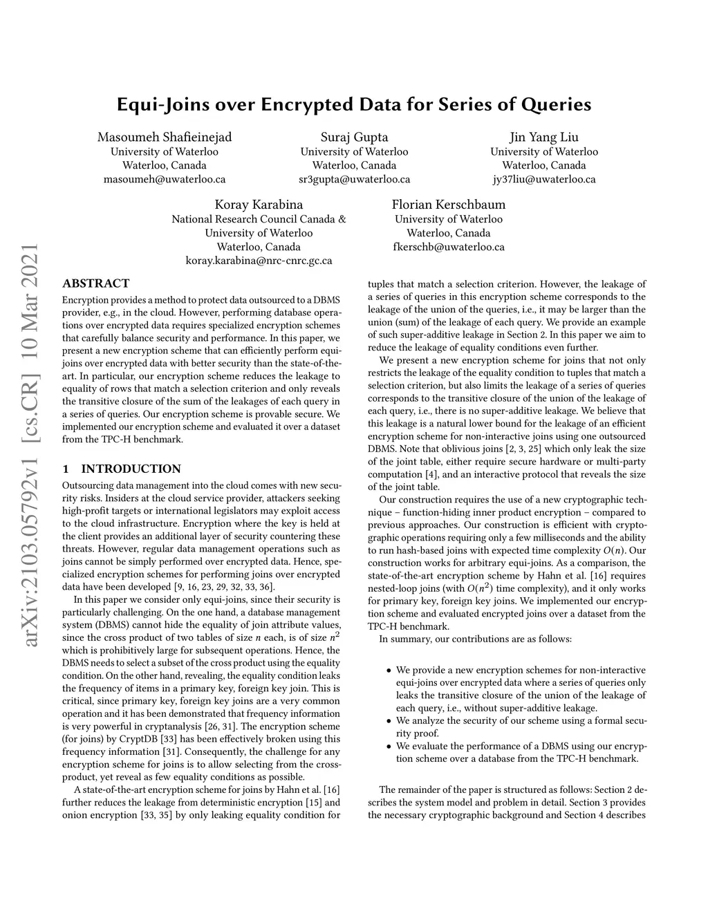 Encryption provides a method to protect data outsourced to a DBMS provider, e.g., in the cloud. However, performing database operations over encrypted data requires specialized encryption schemes that carefully balance security and performance. In this paper, we present a new encryption scheme that can efficiently perform equi-joins over encrypted data with better security than the state-of-the-art. In particular, our encryption scheme reduces the leakage to equality of rows that match a selection criterion and only reveals the transitive closure of the sum of the leakages of each query in a series of queries. Our encryption scheme is provable secure. We implemented our encryption scheme and evaluated it over a dataset from the TPC-H benchmark.