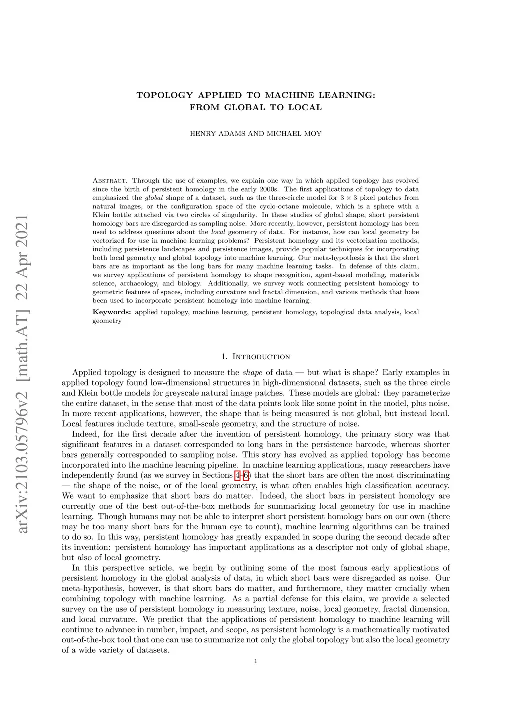 Through the use of examples, we explain one way in which applied topology has evolved since the birth of persistent homology in the early 2000s. The first applications of topology to data emphasized the global shape of a dataset, such as the three-circle model for pixel patches from natural images, or the configuration space of the cyclo-octane molecule, which is a sphere with a Klein bottle attached via two circles of singularity. In these studies of global shape, short persistent homology bars are disregarded as sampling noise. More recently, however, persistent homology has been used to address questions about the local geometry of data. For instance, how can local geometry be vectorized for use in machine learning problems? Persistent homology and its vectorization methods, including persistence landscapes and persistence images, provide popular techniques for incorporating both local geometry and global topology into machine learning. Our meta-hypothesis is that the short bars are as important as the long bars for many machine learning tasks. In defense of this claim, we survey applications of persistent homology to shape recognition, agent-based modeling, materials science, archaeology, and biology. Additionally, we survey work connecting persistent homology to geometric features of spaces, including curvature and fractal dimension, and various methods that have been used to incorporate persistent homology into machine learning.