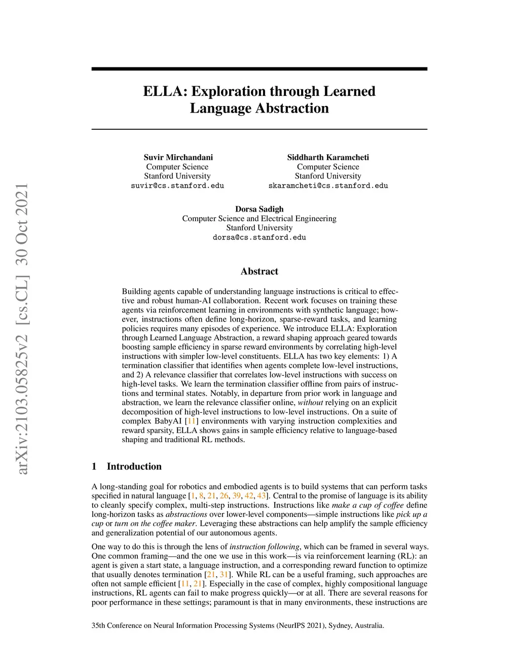 Building agents capable of understanding language instructions is critical to effective and robust human-AI collaboration. Recent work focuses on training these agents via reinforcement learning in environments with synthetic language; however, instructions often define long-horizon, sparse-reward tasks, and learning policies requires many episodes of experience. We introduce ELLA: Exploration through Learned Language Abstraction, a reward shaping approach geared towards boosting sample efficiency in sparse reward environments by correlating high-level instructions with simpler low-level constituents. ELLA has two key elements: 1) A termination classifier that identifies when agents complete low-level instructions, and 2) A relevance classifier that correlates low-level instructions with success on high-level tasks. We learn the termination classifier offline from pairs of instructions and terminal states. Notably, in departure from prior work in language and abstraction, we learn the relevance classifier online, without relying on an explicit decomposition of high-level instructions to low-level instructions. On a suite of complex BabyAI environments with varying instruction complexities and reward sparsity, ELLA shows gains in sample efficiency relative to language-based shaping and traditional RL methods.