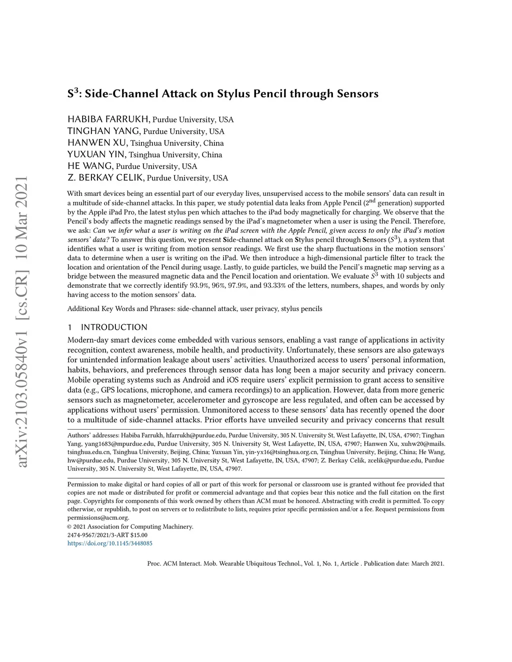 S3: Side-Channel Attack on Stylus Pencil through Sensors