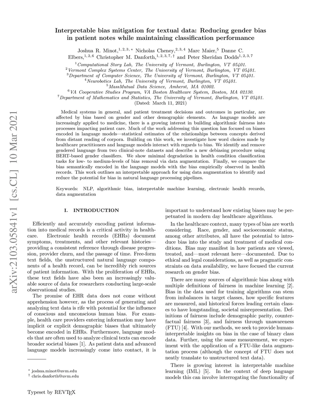 Medical systems in general, and patient treatment decisions and outcomes in particular, are affected by bias based on gender and other demographic elements. As language models are increasingly applied to medicine, there is a growing interest in building algorithmic fairness into processes impacting patient care. Much of the work addressing this question has focused on biases encoded in language models -- statistical estimates of the relationships between concepts derived from distant reading of corpora. Building on this work, we investigate how word choices made by healthcare practitioners and language models interact with regards to bias. We identify and remove gendered language from two clinical-note datasets and describe a new debiasing procedure using BERT-based gender classifiers. We show minimal degradation in health condition classification tasks for low- to medium-levels of bias removal via data augmentation. Finally, we compare the bias semantically encoded in the language models with the bias empirically observed in health records. This work outlines an interpretable approach for using data augmentation to identify and reduce the potential for bias in natural language processing pipelines.