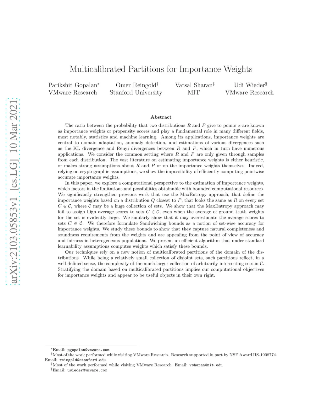 The ratio between the probability that two distributions and give to points are known as importance weights or propensity scores and play a fundamental role in many different fields, most notably, statistics and machine learning. Among its applications, importance weights are central to domain adaptation, anomaly detection, and estimations of various divergences such as the KL divergence. We consider the common setting where and are only given through samples from each distribution. The vast literature on estimating importance weights is either heuristic, or makes strong assumptions about and or on the importance weights themselves. In this paper, we explore a computational perspective to the estimation of importance weights, which factors in the limitations and possibilities obtainable with bounded computational resources. We significantly strengthen previous work that use the MaxEntropy approach, that define the importance weights based on a distribution closest to , that looks the same as on every set , where may be a huge collection of sets. We show that the MaxEntropy approach may fail to assign high average scores to sets , even when the average of ground truth weights for the set is evidently large. We similarly show that it may overestimate the average scores to sets . We therefore formulate Sandwiching bounds as a notion of set-wise accuracy for importance weights. We study these bounds to show that they capture natural completeness and soundness requirements from the weights. We present an efficient algorithm that under standard learnability assumptions computes weights which satisfy these bounds. Our techniques rely on a new notion of multicalibrated partitions of the domain of the distributions, which appear to be useful objects in their own right.