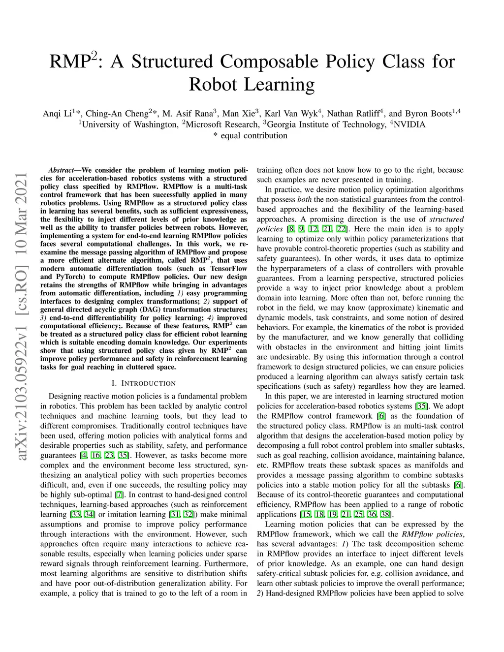 We consider the problem of learning motion policies for acceleration-based robotics systems with a structured policy class specified by RMPflow. RMPflow is a multi-task control framework that has been successfully applied in many robotics problems. Using RMPflow as a structured policy class in learning has several benefits, such as sufficient expressiveness, the flexibility to inject different levels of prior knowledge as well as the ability to transfer policies between robots. However, implementing a system for end-to-end learning RMPflow policies faces several computational challenges. In this work, we re-examine the message passing algorithm of RMPflow and propose a more efficient alternate algorithm, called RMP2, that uses modern automatic differentiation tools (such as TensorFlow and PyTorch) to compute RMPflow policies. Our new design retains the strengths of RMPflow while bringing in advantages from automatic differentiation, including 1) easy programming interfaces to designing complex transformations; 2) support of general directed acyclic graph (DAG) transformation structures; 3) end-to-end differentiability for policy learning; 4) improved computational efficiency. Because of these features, RMP2 can be treated as a structured policy class for efficient robot learning which is suitable encoding domain knowledge. Our experiments show that using structured policy class given by RMP2 can improve policy performance and safety in reinforcement learning tasks for goal reaching in cluttered space.