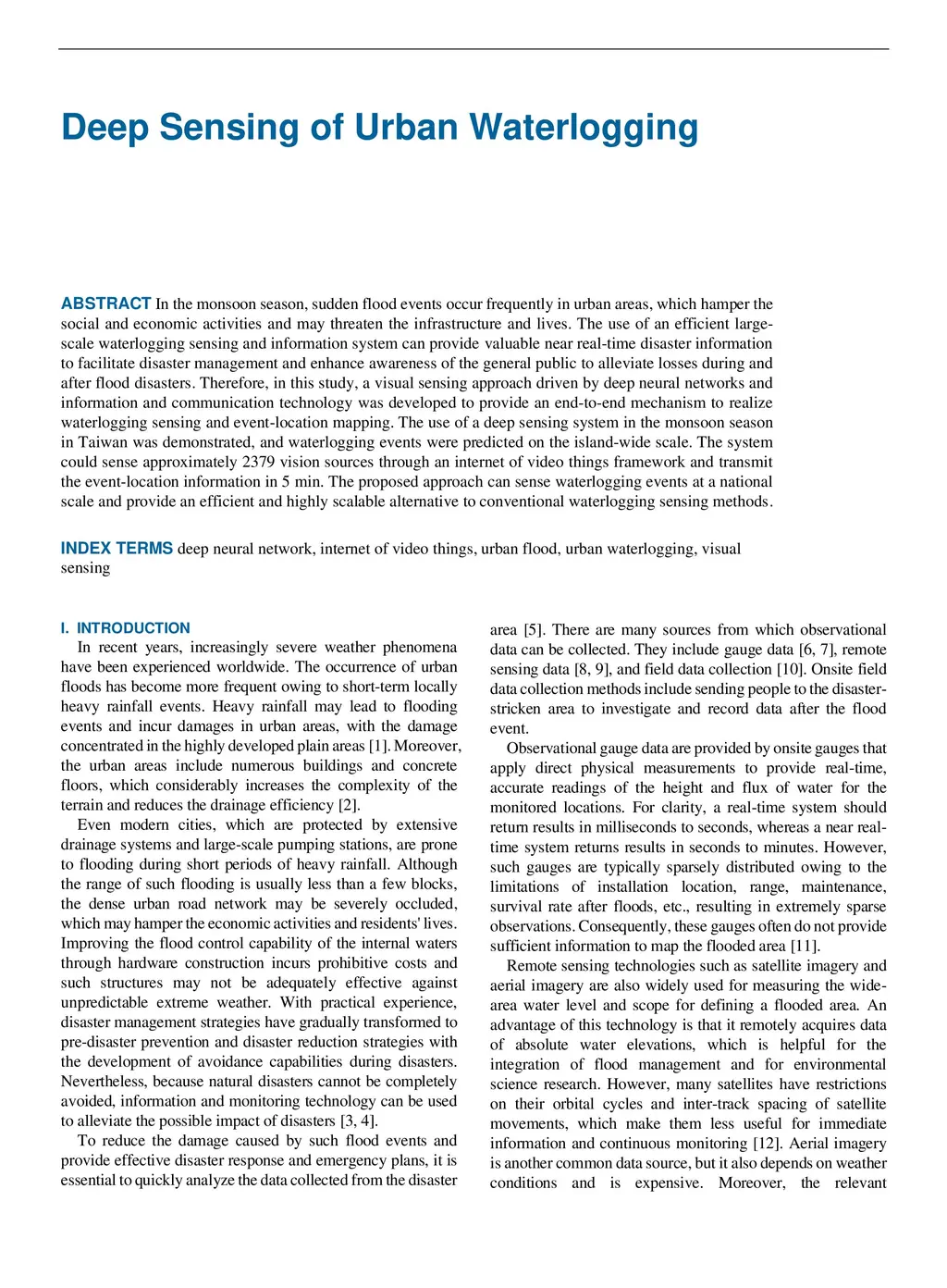 In the monsoon season, sudden flood events occur frequently in urban areas, which hamper the social and economic activities and may threaten the infrastructure and lives. The use of an efficient large-scale waterlogging sensing and information system can provide valuable real-time disaster information to facilitate disaster management and enhance awareness of the general public to alleviate losses during and after flood disasters. Therefore, in this study, a visual sensing approach driven by deep neural networks and information and communication technology was developed to provide an end-to-end mechanism to realize waterlogging sensing and event-location mapping. The use of a deep sensing system in the monsoon season in Taiwan was demonstrated, and waterlogging events were predicted on the island-wide scale. The system could sense approximately 2379 vision sources through an internet of video things framework and transmit the event-location information in 5 min. The proposed approach can sense waterlogging events at a national scale and provide an efficient and highly scalable alternative to conventional waterlogging sensing methods.