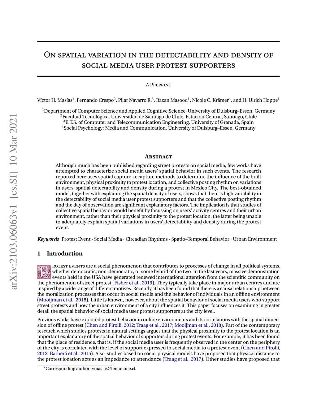 Although much has been published regarding street protests on social media, few works have attempted to characterize social media users' spatial behavior in such events. The research reported here uses spatial capture-recapture methods to determine the influence of the built environment, physical proximity to protest location, and collective posting rhythm on variations in users' spatial detectability and density during a protest in Mexico City. The best-obtained model, together with explaining the spatial density of users, shows that there is high variability in the detectability of social media user protest supporters and that the collective posting rhythm and the day of observation are significant explanatory factors. The implication is that studies of collective spatial behavior would benefit by focussing on users' activity centres and their urban environment, rather than their physical proximity to the protest location, the latter being unable to adequately explain spatial variations in users' detectability and density during the protest event.