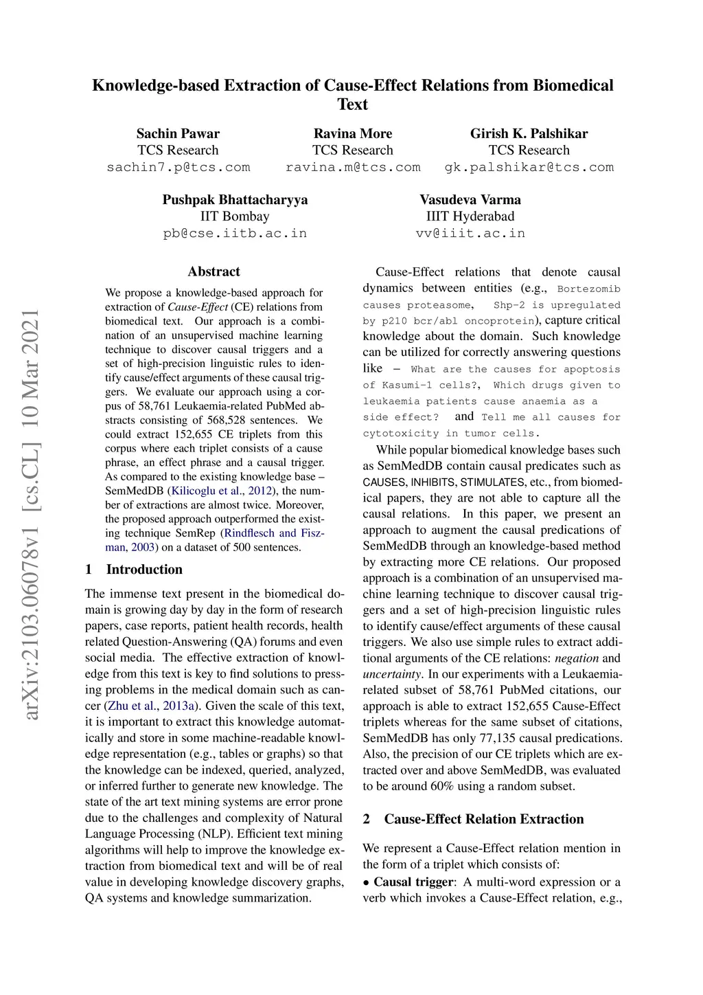 We propose a knowledge-based approach for extraction of Cause-Effect (CE) relations from biomedical text. Our approach is a combination of an unsupervised machine learning technique to discover causal triggers and a set of high-precision linguistic rules to identify cause/effect arguments of these causal triggers. We evaluate our approach using a corpus of 58,761 Leukaemia-related PubMed abstracts consisting of 568,528 sentences. We could extract 152,655 CE triplets from this corpus where each triplet consists of a cause phrase, an effect phrase and a causal trigger. As compared to the existing knowledge base - SemMedDB (Kilicoglu et al., 2012), the number of extractions are almost twice. Moreover, the proposed approach outperformed the existing technique SemRep (Rindflesch and Fiszman, 2003) on a dataset of 500 sentences.