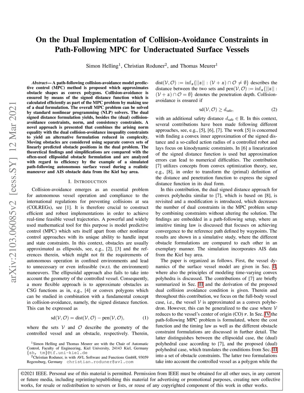 A path-following collision-avoidance model predictive control (MPC) method is proposed which approximates obstacle shapes as convex polygons. Collision-avoidance is ensured by means of the signed distance function which is calculated efficiently as part of the MPC problem by making use of a dual formulation. The overall MPC problem can be solved by standard nonlinear programming (NLP) solvers. The dual signed distance formulation yields, besides the (dual) collision-avoidance constraints, norm, and consistency constraints. A novel approach is presented that combines the arising norm equality with the dual collision-avoidance inequality constraints to yield an alternative formulation reduced in complexity. Moving obstacles are considered using separate convex sets of linearly predicted obstacle positions in the dual problem. The theoretical findings and simplifications are compared with the often-used ellipsoidal obstacle formulation and are analyzed with regard to efficiency by the example of a simulated path-following autonomous surface vessel during a realistic maneuver and AIS obstacle data from the Kiel bay area.