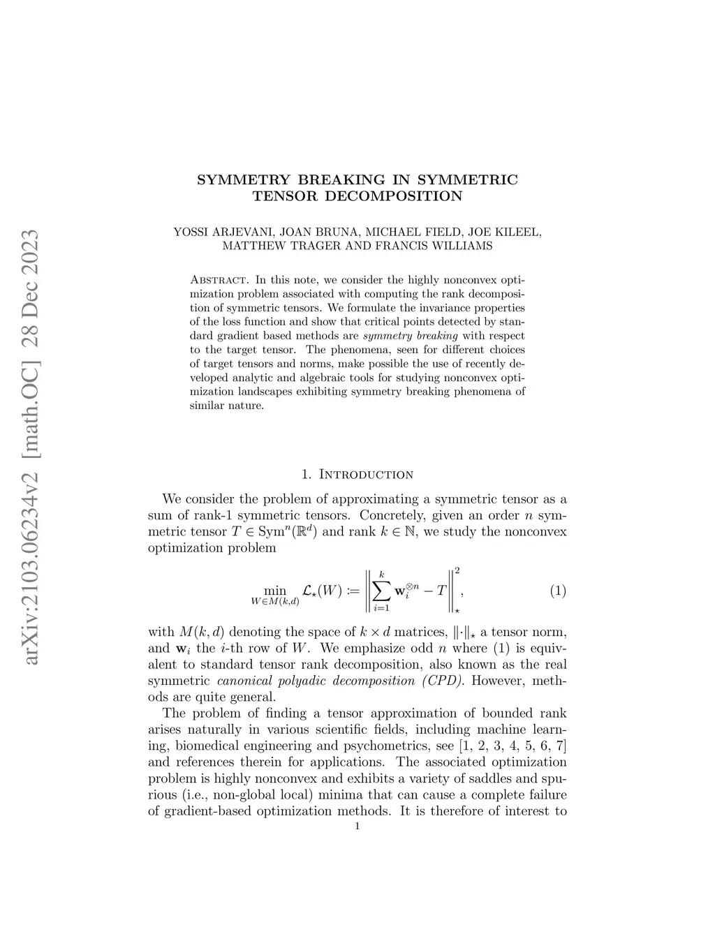 In this note, we consider the highly nonconvex optimization problem associated with computing the rank decomposition of symmetric tensors. We formulate the invariance properties of the loss function and show that critical points detected by standard gradient based methods are \emph{symmetry breaking} with respect to the target tensor. The phenomena, seen for different choices of target tensors and norms, make possible the use of recently developed analytic and algebraic tools for studying nonconvex optimization landscapes exhibiting symmetry breaking phenomena of similar nature.