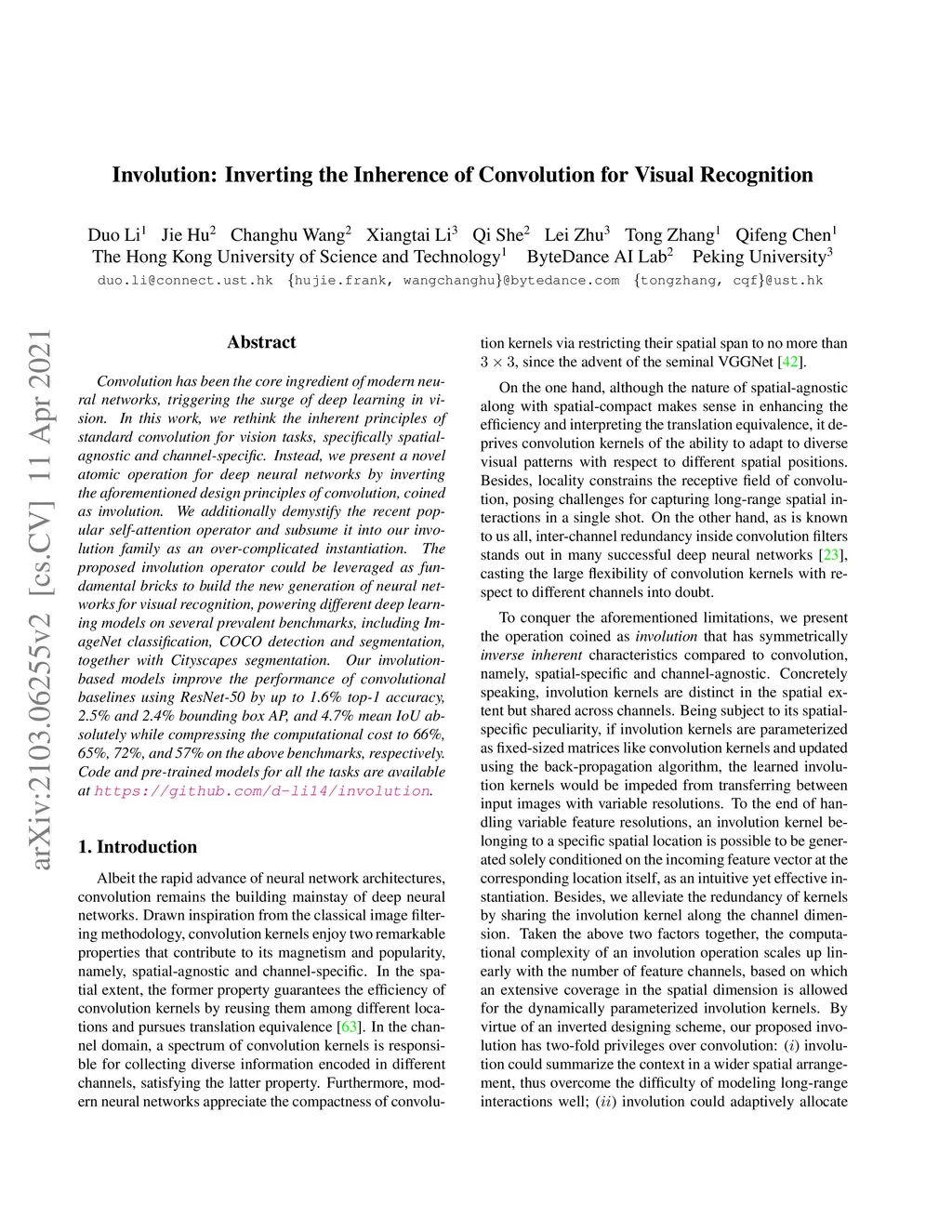 Convolution has been the core ingredient of modern neural networks, triggering the surge of deep learning in vision. In this work, we rethink the inherent principles of standard convolution for vision tasks, specifically spatial-agnostic and channel-specific. Instead, we present a novel atomic operation for deep neural networks by inverting the aforementioned design principles of convolution, coined as involution. We additionally demystify the recent popular self-attention operator and subsume it into our involution family as an over-complicated instantiation. The proposed involution operator could be leveraged as fundamental bricks to build the new generation of neural networks for visual recognition, powering different deep learning models on several prevalent benchmarks, including ImageNet classification, COCO detection and segmentation, together with Cityscapes segmentation. Our involution-based models improve the performance of convolutional baselines using ResNet-50 by up to 1.6% top-1 accuracy, 2.5% and 2.4% bounding box AP, and 4.7% mean IoU absolutely while compressing the computational cost to 66%, 65%, 72%, and 57% on the above benchmarks, respectively. Code and pre-trained models for all the tasks are available at https://github.com/d-li14/involution.