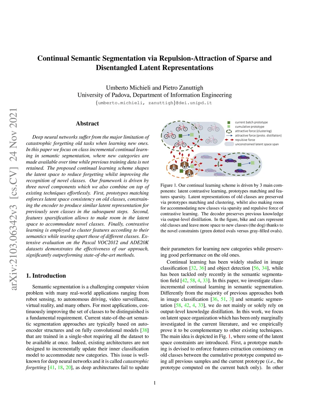 Deep neural networks suffer from the major limitation of catastrophic forgetting old tasks when learning new ones. In this paper we focus on class incremental continual learning in semantic segmentation, where new categories are made available over time while previous training data is not retained. The proposed continual learning scheme shapes the latent space to reduce forgetting whilst improving the recognition of novel classes. Our framework is driven by three novel components which we also combine on top of existing techniques effortlessly. First, prototypes matching enforces latent space consistency on old classes, constraining the encoder to produce similar latent representation for previously seen classes in the subsequent steps. Second, features sparsification allows to make room in the latent space to accommodate novel classes. Finally, contrastive learning is employed to cluster features according to their semantics while tearing apart those of different classes. Extensive evaluation on the Pascal VOC2012 and ADE20K datasets demonstrates the effectiveness of our approach, significantly outperforming state-of-the-art methods.