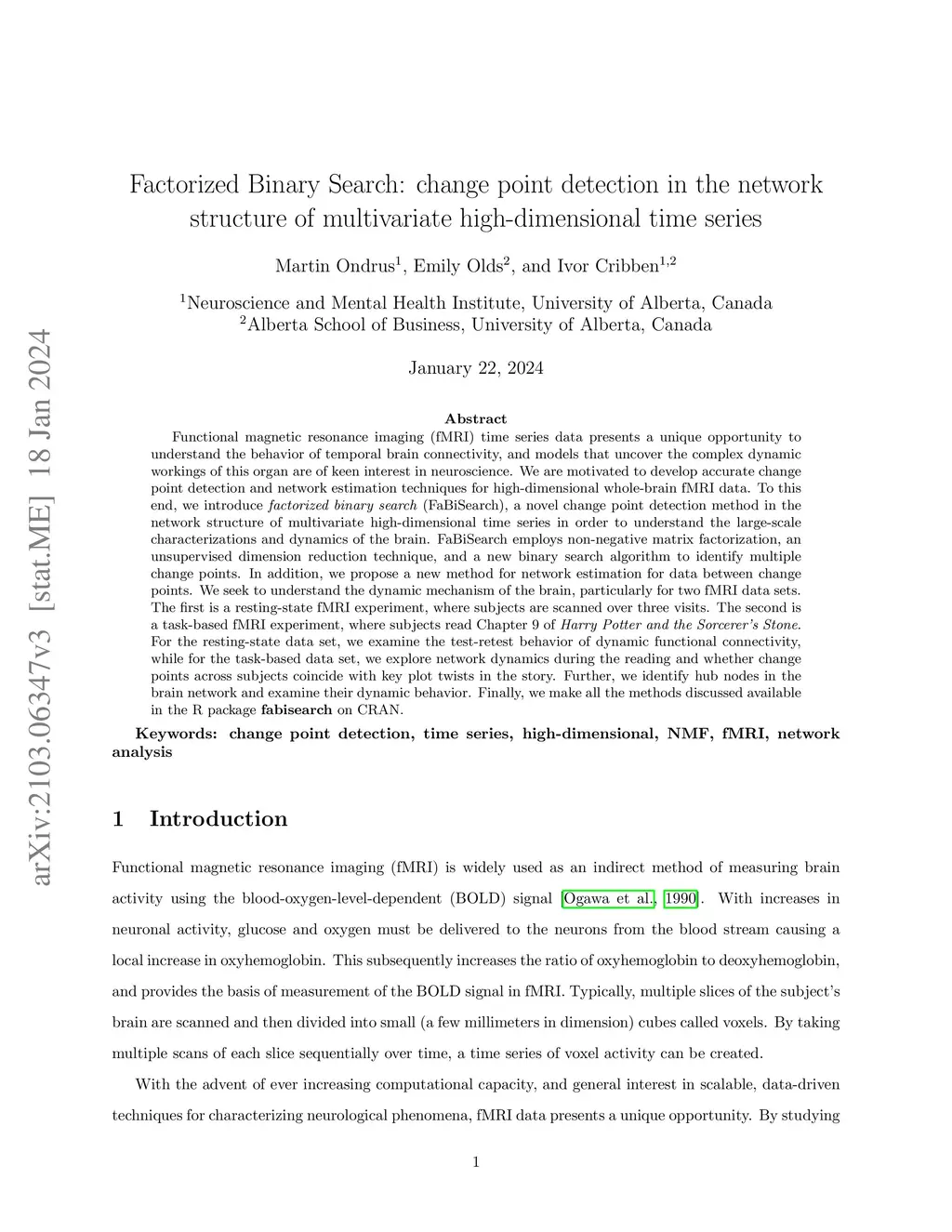 Functional magnetic resonance imaging (fMRI) time series data presents a unique opportunity to understand temporal brain connectivity, and models that uncover the complex dynamic workings of this organ are of keen interest in neuroscience. Change point models can capture and reflect the dynamic nature of brain connectivity, however methods that translate well into a high-dimensional context (where p>>n) are scarce. To this end, we introduce factorized binary search (FaBiSearch), a novel change point detection method in the network structure of multivariate high-dimensional time series. FaBiSearch uses non-negative matrix factorization, an unsupervised dimension reduction technique, and a new binary search algorithm to identify multiple change points. In addition, we propose a new method for network estimation for data between change points. We show that FaBiSearch outperforms another state-of-the-art method on simulated data sets and we apply FaBiSearch to a resting-state and to a task-based fMRI data set. In particular, for the task-based data set, we explore network dynamics during the reading of Chapter 9 in Harry Potter and the Sorcerer's Stone and find that change points across subjects coincide with key plot twists. Further, we find that the density of networks was positively related to the frequency of speech between characters in the story. Finally, we make all the methods discussed available in the R package fabisearch on CRAN.