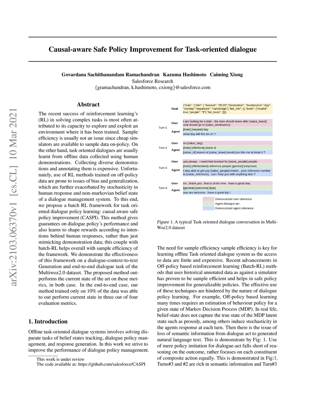 The recent success of reinforcement learning's (RL) in solving complex tasks is most often attributed to its capacity to explore and exploit an environment where it has been trained. Sample efficiency is usually not an issue since cheap simulators are available to sample data on-policy. On the other hand, task oriented dialogues are usually learnt from offline data collected using human demonstrations. Collecting diverse demonstrations and annotating them is expensive. Unfortunately, use of RL methods trained on off-policy data are prone to issues of bias and generalization, which are further exacerbated by stochasticity in human response and non-markovian belief state of a dialogue management system. To this end, we propose a batch RL framework for task oriented dialogue policy learning: causal aware safe policy improvement (CASPI). This method gives guarantees on dialogue policy's performance and also learns to shape rewards according to intentions behind human responses, rather than just mimicking demonstration data; this couple with batch-RL helps overall with sample efficiency of the framework. We demonstrate the effectiveness of this framework on a dialogue-context-to-text Generation and end-to-end dialogue task of the Multiwoz2.0 dataset. The proposed method outperforms the current state of the art on these metrics, in both case. In the end-to-end case, our method trained only on 10\% of the data was able to out perform current state in three out of four evaluation metrics.