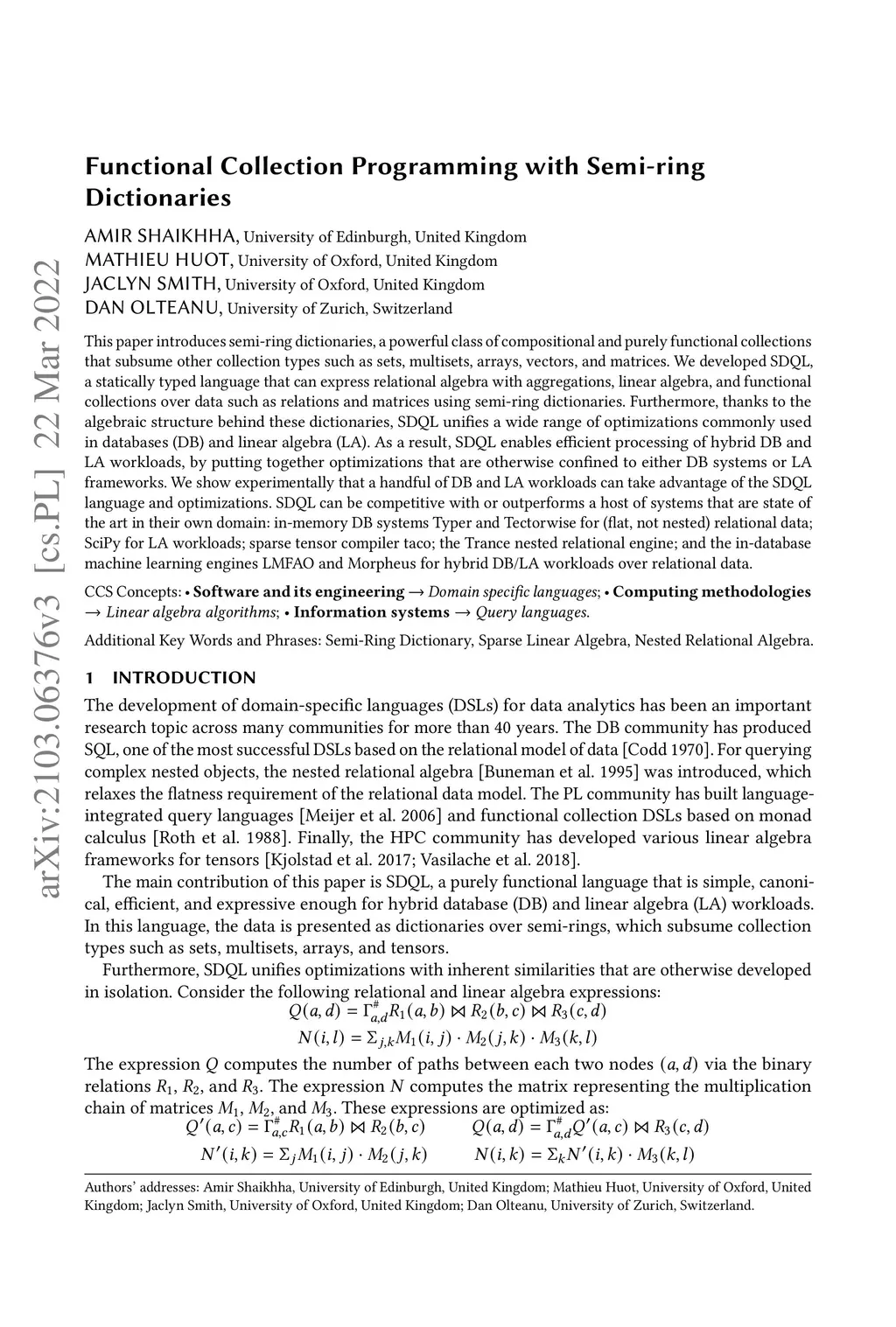 This paper introduces semi-ring dictionaries, a powerful class of compositional and purely functional collections that subsume other collection types such as sets, multisets, arrays, vectors, and matrices. We developed SDQL, a statically typed language that can express relational algebra with aggregations, linear algebra, and functional collections over data such as relations and matrices using semi-ring dictionaries. Furthermore, thanks to the algebraic structure behind these dictionaries, SDQL unifies a wide range of optimizations commonly used in databases (DB) and linear algebra (LA). As a result, SDQL enables efficient processing of hybrid DB and LA workloads, by putting together optimizations that are otherwise confined to either DB systems or LA frameworks. We show experimentally that a handful of DB and LA workloads can take advantage of the SDQL language and optimizations. SDQL can be competitive with or outperforms a host of systems that are state of the art in their own domain: in-memory DB systems Typer and Tectorwise for (flat, not nested) relational data; SciPy for LA workloads; sparse tensor compiler taco; the Trance nested relational engine; and the in-database machine learning engines LMFAO and Morpheus for hybrid DB/LA workloads over relational data.