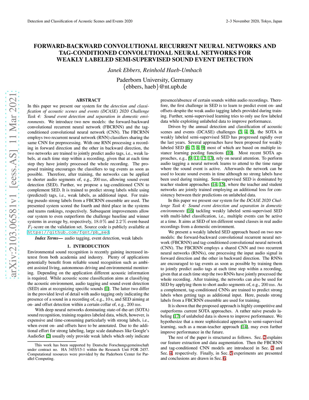 In this paper we present our system for the detection and classification of acoustic scenes and events (DCASE) 2020 Challenge Task 4: Sound event detection and separation in domestic environments. We introduce two new models: the forward-backward convolutional recurrent neural network (FBCRNN) and the tag-conditioned convolutional neural network (CNN). The FBCRNN employs two recurrent neural network (RNN) classifiers sharing the same CNN for preprocessing. With one RNN processing a recording in forward direction and the other in backward direction, the two networks are trained to jointly predict audio tags, i.e., weak labels, at each time step within a recording, given that at each time step they have jointly processed the whole recording. The proposed training encourages the classifiers to tag events as soon as possible. Therefore, after training, the networks can be applied to shorter audio segments of, e.g., 200 ms, allowing sound event detection (SED). Further, we propose a tag-conditioned CNN to complement SED. It is trained to predict strong labels while using (predicted) tags, i.e., weak labels, as additional input. For training pseudo strong labels from a FBCRNN ensemble are used. The presented system scored the fourth and third place in the systems and teams rankings, respectively. Subsequent improvements allow our system to even outperform the challenge baseline and winner systems in average by, respectively, 18.0% and 2.2% event-based F1-score on the validation set. Source code is publicly available at https://github.com/fgnt/pb_sed.