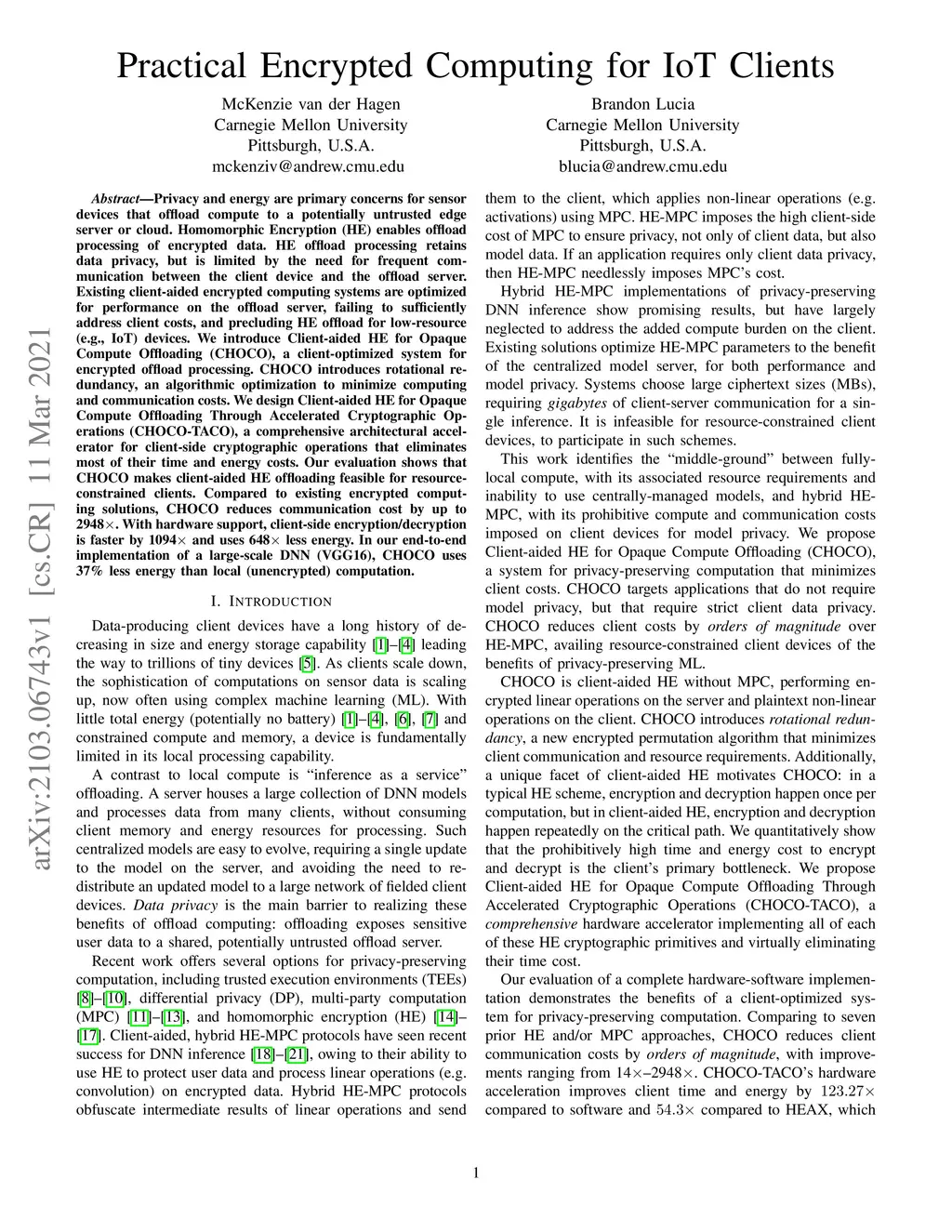 Privacy and energy are primary concerns for sensor devices that offload compute to a potentially untrusted edge server or cloud. Homomorphic Encryption (HE) enables offload processing of encrypted data. HE offload processing retains data privacy, but is limited by the need for frequent communication between the client device and the offload server. Existing client-aided encrypted computing systems are optimized for performance on the offload server, failing to sufficiently address client costs, and precluding HE offload for low-resource (e.g., IoT) devices. We introduce Client-aided HE for Opaque Compute Offloading (CHOCO), a client-optimized system for encrypted offload processing. CHOCO introduces rotational redundancy, an algorithmic optimization to minimize computing and communication costs. We design Client-Aided HE for Opaque Compute Offloading Through Accelerated Cryptographic Operations (CHOCO-TACO), a comprehensive architectural accelerator for client-side cryptographic operations that eliminates most of their time and energy costs. Our evaluation shows that CHOCO makes client-aided HE offloading feasible for resource-constrained clients. Compared to existing encrypted computing solutions, CHOCO reduces communication cost by up to 2948x. With hardware support, client-side encryption/decryption is faster by 1094x and uses 648x less energy. In our end-to-end implementation of a large-scale DNN (VGG16), CHOCO uses 37% less energy than local (unencrypted) computation.