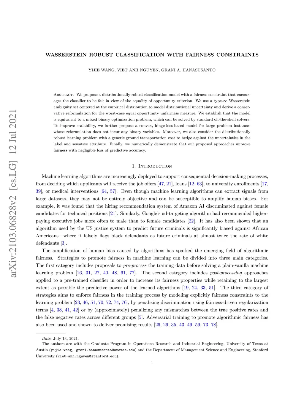 We propose a distributionally robust classification model with a fairness constraint that encourages the classifier to be fair in view of the equality of opportunity criterion. We use a type- Wasserstein ambiguity set centered at the empirical distribution to model distributional uncertainty and derive a conservative reformulation for the worst-case equal opportunity unfairness measure. We establish that the model is equivalent to a mixed binary optimization problem, which can be solved by standard off-the-shelf solvers. To improve scalability, we further propose a convex, hinge-loss-based model for large problem instances whose reformulation does not incur any binary variables. Moreover, we also consider the distributionally robust learning problem with a generic ground transportation cost to hedge against the uncertainties in the label and sensitive attribute. Finally, we numerically demonstrate that our proposed approaches improve fairness with negligible loss of predictive accuracy.