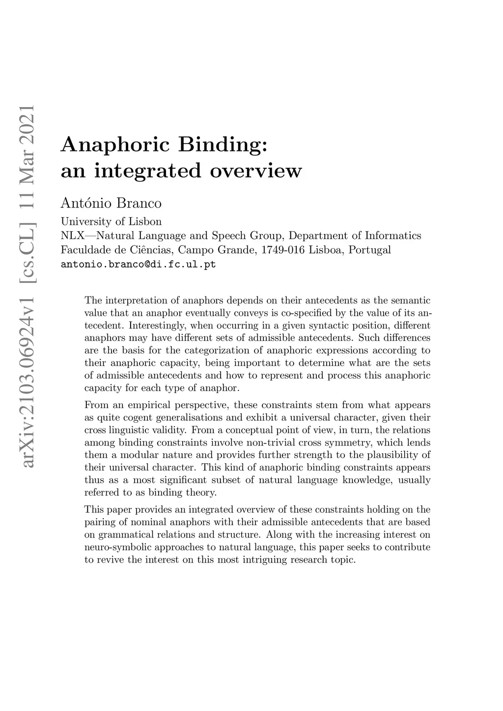 The interpretation of anaphors depends on their antecedents as the semantic value that an anaphor eventually conveys is co-specified by the value of its antecedent. Interestingly, when occurring in a given syntactic position, different anaphors may have different sets of admissible antecedents. Such differences are the basis for the categorization of anaphoric expressions according to their anaphoric capacity, being important to determine what are the sets of admissible antecedents and how to represent and process this anaphoric capacity for each type of anaphor. From an empirical perspective, these constraints stem from what appears as quite cogent generalisations and exhibit a universal character, given their cross linguistic validity. From a conceptual point of view, in turn, the relations among binding constraints involve non-trivial cross symmetry, which lends them a modular nature and provides further strength to the plausibility of their universal character. This kind of anaphoric binding constraints appears thus as a most significant subset of natural language knowledge, usually referred to as binding theory. This paper provides an integrated overview of these constraints holding on the pairing of nominal anaphors with their admissible antecedents that are based on grammatical relations and structure. Along with the increasing interest on neuro-symbolic approaches to natural language, this paper seeks to contribute to revive the interest on this most intriguing research topic.