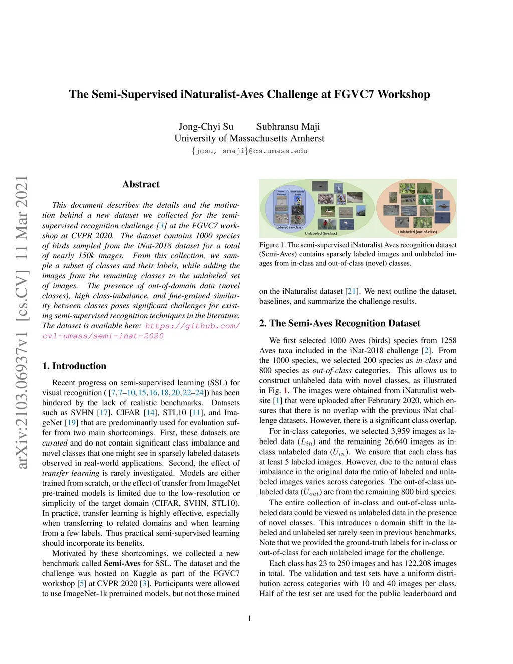 The Semi-Supervised iNaturalist-Aves Challenge at FGVC7 Workshop