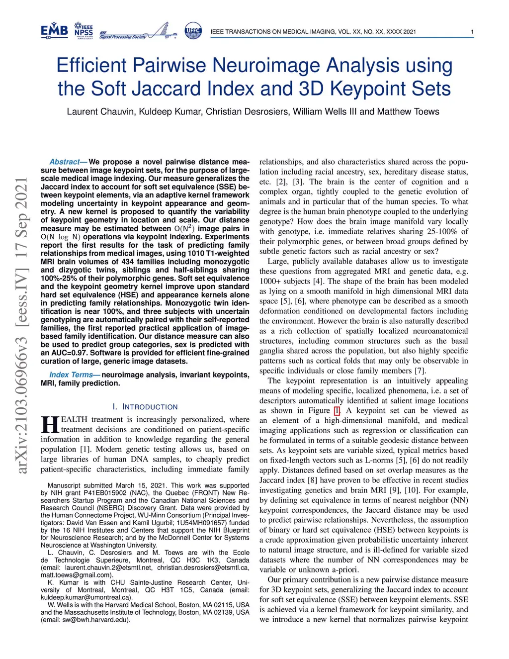 We propose a novel pairwise distance measure between image keypoint sets, for the purpose of large-scale medical image indexing. Our measure generalizes the Jaccard index to account for soft set equivalence (SSE) between keypoint elements, via an adaptive kernel framework modeling uncertainty in keypoint appearance and geometry. A new kernel is proposed to quantify the variability of keypoint geometry in location and scale. Our distance measure may be estimated between image pairs in operations via keypoint indexing. Experiments report the first results for the task of predicting family relationships from medical images, using 1010 T1-weighted MRI brain volumes of 434 families including monozygotic and dizygotic twins, siblings and half-siblings sharing 100%-25% of their polymorphic genes. Soft set equivalence and the keypoint geometry kernel improve upon standard hard set equivalence (HSE) and appearance kernels alone in predicting family relationships. Monozygotic twin identification is near 100%, and three subjects with uncertain genotyping are automatically paired with their self-reported families, the first reported practical application of image-based family identification. Our distance measure can also be used to predict group categories, sex is predicted with an AUC=0.97. Software is provided for efficient fine-grained curation of large, generic image datasets.
