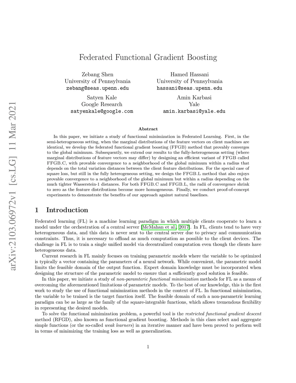 In this paper, we initiate a study of functional minimization in Federated Learning. First, in the semi-heterogeneous setting, when the marginal distributions of the feature vectors on client machines are identical, we develop the federated functional gradient boosting (FFGB) method that provably converges to the global minimum. Subsequently, we extend our results to the fully-heterogeneous setting (where marginal distributions of feature vectors may differ) by designing an efficient variant of FFGB called FFGB.C, with provable convergence to a neighborhood of the global minimum within a radius that depends on the total variation distances between the client feature distributions. For the special case of square loss, but still in the fully heterogeneous setting, we design the FFGB.L method that also enjoys provable convergence to a neighborhood of the global minimum but within a radius depending on the much tighter Wasserstein-1 distances. For both FFGB.C and FFGB.L, the radii of convergence shrink to zero as the feature distributions become more homogeneous. Finally, we conduct proof-of-concept experiments to demonstrate the benefits of our approach against natural baselines.