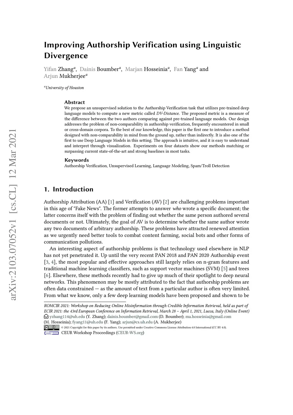 We propose an unsupervised solution to the Authorship Verification task that utilizes pre-trained deep language models to compute a new metric called DV-Distance. The proposed metric is a measure of the difference between the two authors comparing against pre-trained language models. Our design addresses the problem of non-comparability in authorship verification, frequently encountered in small or cross-domain corpora. To the best of our knowledge, this paper is the first one to introduce a method designed with non-comparability in mind from the ground up, rather than indirectly. It is also one of the first to use Deep Language Models in this setting. The approach is intuitive, and it is easy to understand and interpret through visualization. Experiments on four datasets show our methods matching or surpassing current state-of-the-art and strong baselines in most tasks.