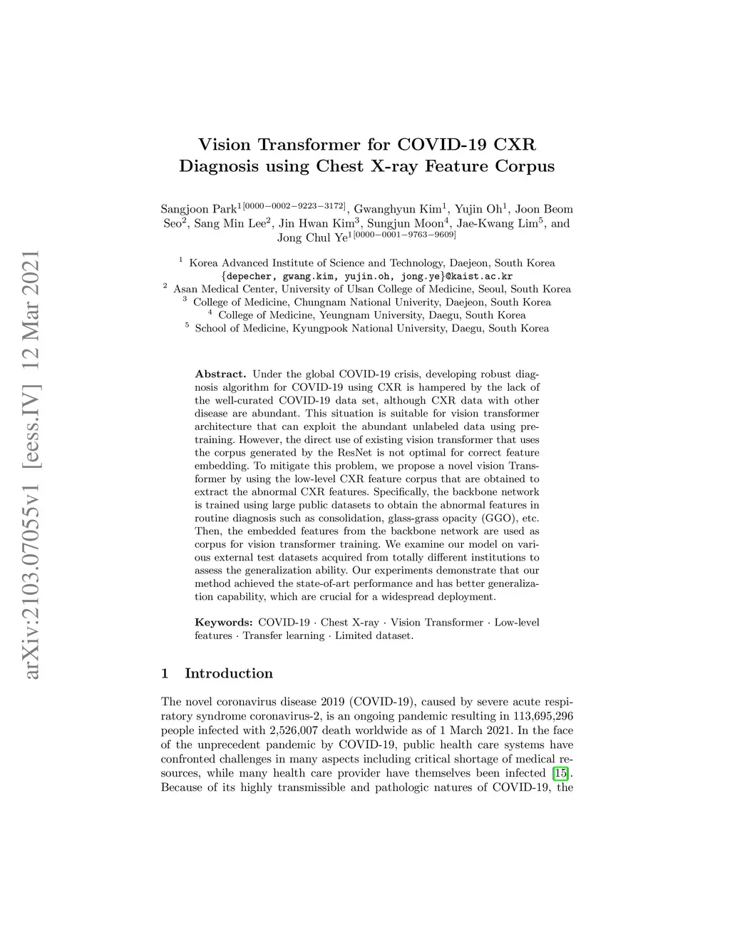 Under the global COVID-19 crisis, developing robust diagnosis algorithm for COVID-19 using CXR is hampered by the lack of the well-curated COVID-19 data set, although CXR data with other disease are abundant. This situation is suitable for vision transformer architecture that can exploit the abundant unlabeled data using pre-training. However, the direct use of existing vision transformer that uses the corpus generated by the ResNet is not optimal for correct feature embedding. To mitigate this problem, we propose a novel vision Transformer by using the low-level CXR feature corpus that are obtained to extract the abnormal CXR features. Specifically, the backbone network is trained using large public datasets to obtain the abnormal features in routine diagnosis such as consolidation, glass-grass opacity (GGO), etc. Then, the embedded features from the backbone network are used as corpus for vision transformer training. We examine our model on various external test datasets acquired from totally different institutions to assess the generalization ability. Our experiments demonstrate that our method achieved the state-of-art performance and has better generalization capability, which are crucial for a widespread deployment.
