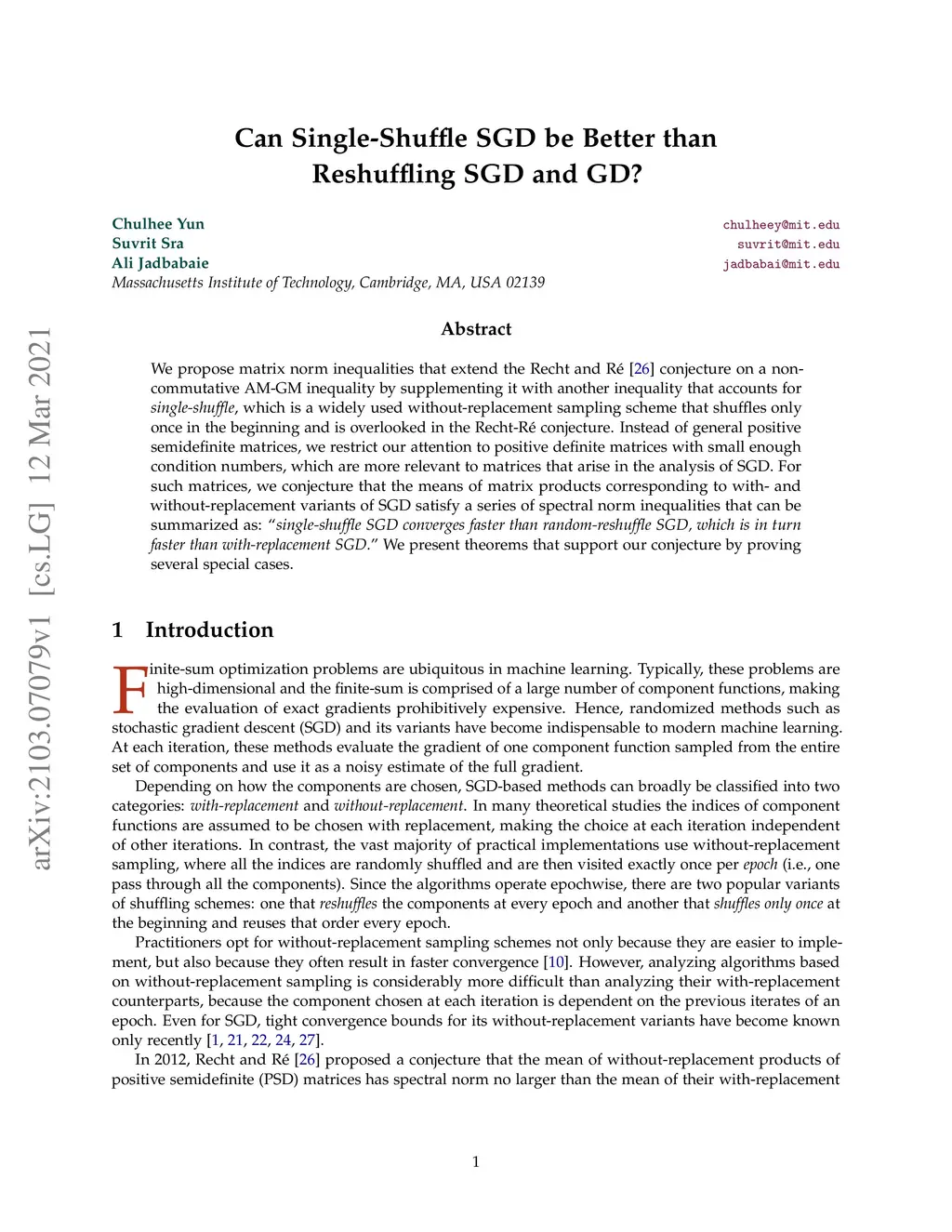 We propose matrix norm inequalities that extend the Recht-R\é (2012) conjecture on a noncommutative AM-GM inequality by supplementing it with another inequality that accounts for single-shuffle, which is a widely used without-replacement sampling scheme that shuffles only once in the beginning and is overlooked in the Recht-R\é conjecture. Instead of general positive semidefinite matrices, we restrict our attention to positive definite matrices with small enough condition numbers, which are more relevant to matrices that arise in the analysis of SGD. For such matrices, we conjecture that the means of matrix products corresponding to with- and without-replacement variants of SGD satisfy a series of spectral norm inequalities that can be summarized as: "single-shuffle SGD converges faster than random-reshuffle SGD, which is in turn faster than with-replacement SGD." We present theorems that support our conjecture by proving several special cases.