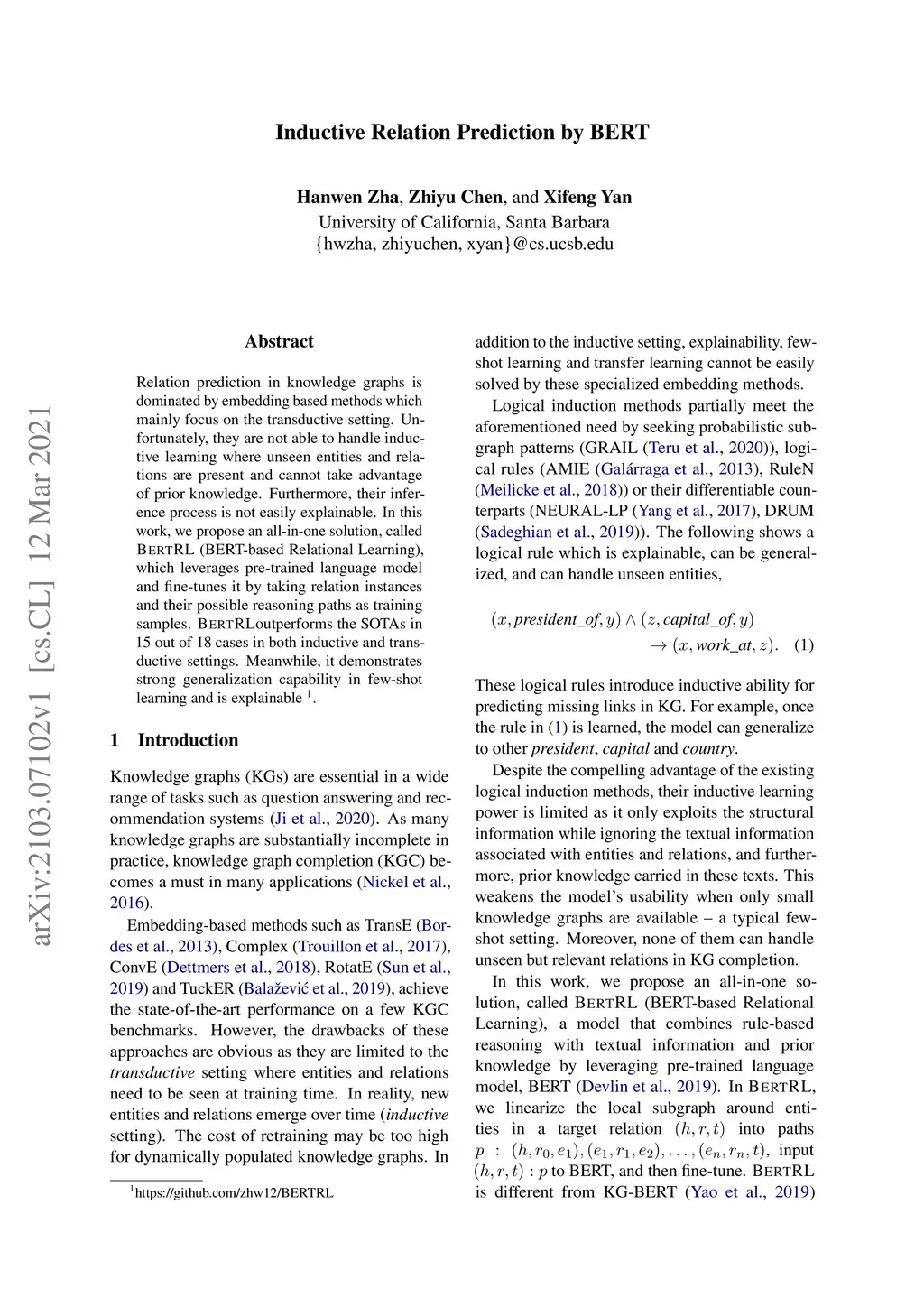 Relation prediction in knowledge graphs is dominated by embedding based methods which mainly focus on the transductive setting. Unfortunately, they are not able to handle inductive learning where unseen entities and relations are present and cannot take advantage of prior knowledge. Furthermore, their inference process is not easily explainable. In this work, we propose an all-in-one solution, called BERTRL (BERT-based Relational Learning), which leverages pre-trained language model and fine-tunes it by taking relation instances and their possible reasoning paths as training samples. BERTRL outperforms the SOTAs in 15 out of 18 cases in both inductive and transductive settings. Meanwhile, it demonstrates strong generalization capability in few-shot learning and is explainable.