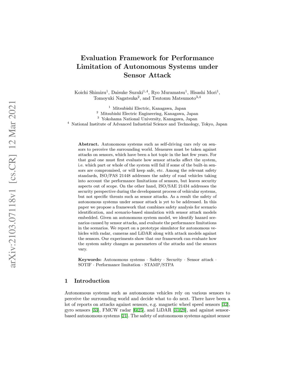 Autonomous systems such as self-driving cars rely on sensors to perceive the surrounding world. Measures must be taken against attacks on sensors, which have been a hot topic in the last few years. For that goal one must first evaluate how sensor attacks affect the system, i.e. which part or whole of the system will fail if some of the built-in sensors are compromised, or will keep safe, etc. Among the relevant safety standards, ISO/PAS 21448 addresses the safety of road vehicles taking into account the performance limitations of sensors, but leaves security aspects out of scope. On the other hand, ISO/SAE 21434 addresses the security perspective during the development process of vehicular systems, but not specific threats such as sensor attacks. As a result the safety of autonomous systems under sensor attack is yet to be addressed. In this paper we propose a framework that combines safety analysis for scenario identification, and scenario-based simulation with sensor attack models embedded. Given an autonomous system model, we identify hazard scenarios caused by sensor attacks, and evaluate the performance limitations in the scenarios. We report on a prototype simulator for autonomous vehicles with radar, cameras and LiDAR along with attack models against the sensors. Our experiments show that our framework can evaluate how the system safety changes as parameters of the attacks and the sensors vary.