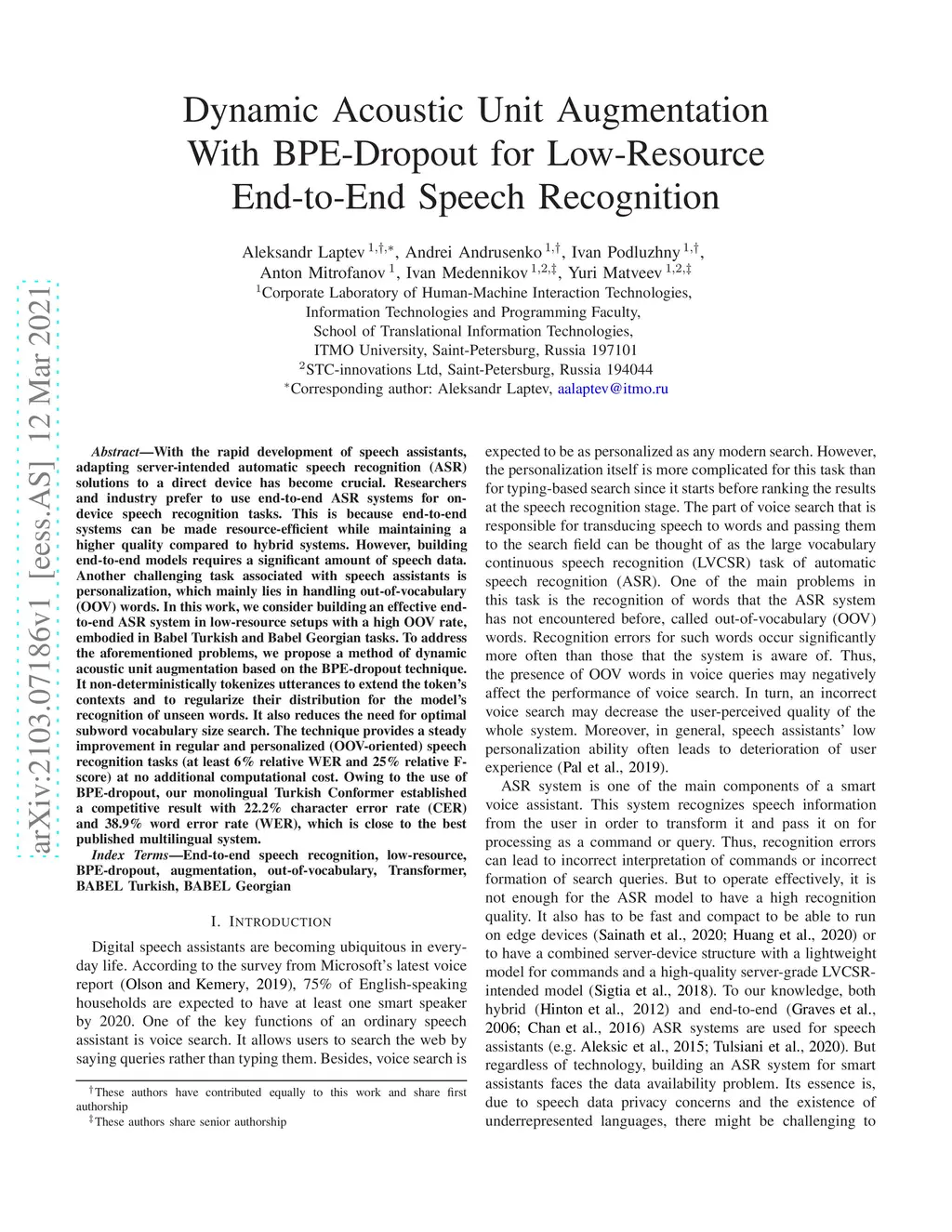 With the rapid development of speech assistants, adapting server-intended automatic speech recognition (ASR) solutions to a direct device has become crucial. Researchers and industry prefer to use end-to-end ASR systems for on-device speech recognition tasks. This is because end-to-end systems can be made resource-efficient while maintaining a higher quality compared to hybrid systems. However, building end-to-end models requires a significant amount of speech data. Another challenging task associated with speech assistants is personalization, which mainly lies in handling out-of-vocabulary (OOV) words. In this work, we consider building an effective end-to-end ASR system in low-resource setups with a high OOV rate, embodied in Babel Turkish and Babel Georgian tasks. To address the aforementioned problems, we propose a method of dynamic acoustic unit augmentation based on the BPE-dropout technique. It non-deterministically tokenizes utterances to extend the token's contexts and to regularize their distribution for the model's recognition of unseen words. It also reduces the need for optimal subword vocabulary size search. The technique provides a steady improvement in regular and personalized (OOV-oriented) speech recognition tasks (at least 6% relative WER and 25% relative F-score) at no additional computational cost. Owing to the use of BPE-dropout, our monolingual Turkish Conformer established a competitive result with 22.2% character error rate (CER) and 38.9% word error rate (WER), which is close to the best published multilingual system.