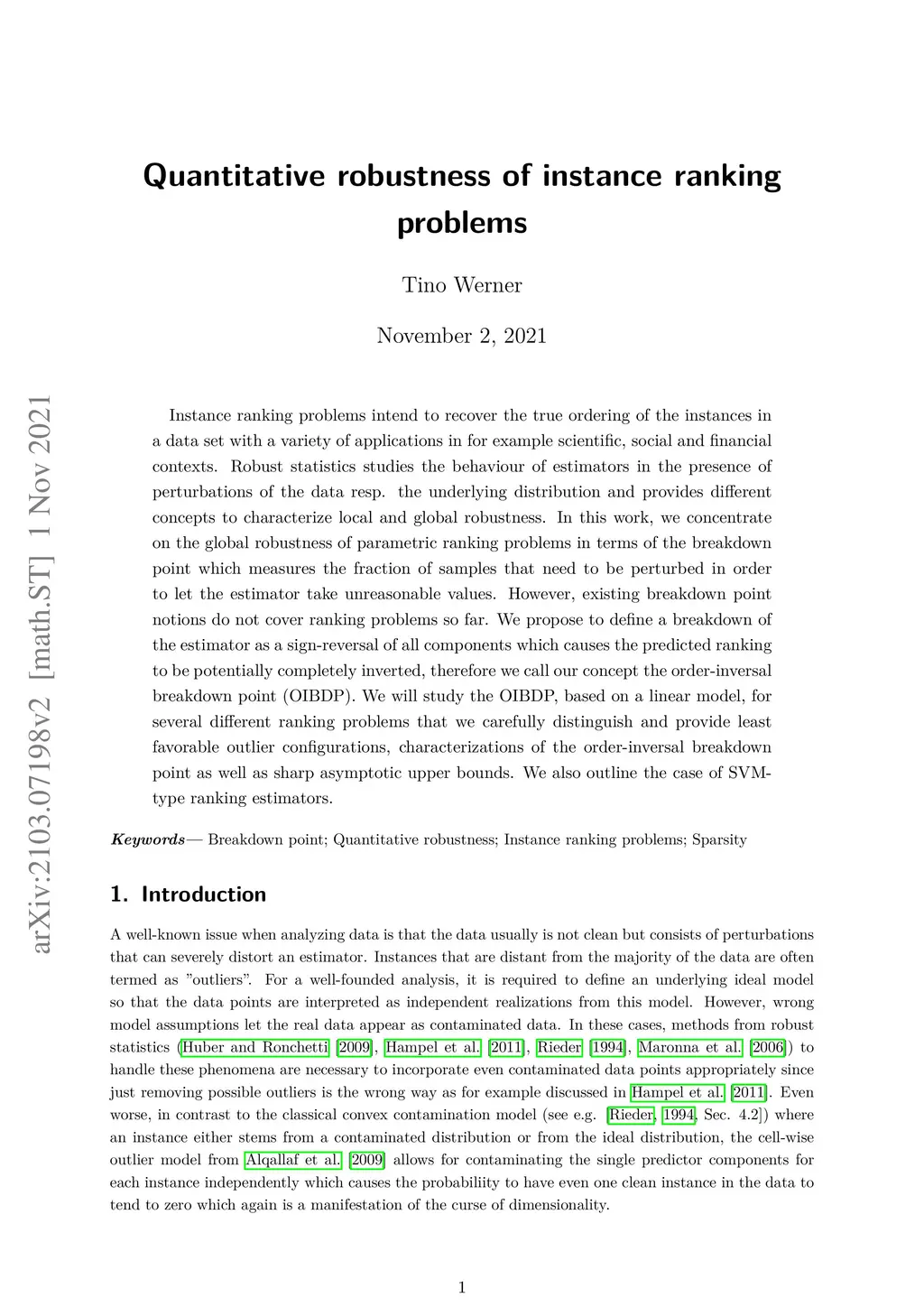 Instance ranking problems intend to recover the true ordering of the instances in a data set with a variety of applications in for example scientific, social and financial contexts. Robust statistics studies the behaviour of estimators in the presence of perturbations of the data resp. the underlying distribution and provides different concepts to characterize local and global robustness. In this work, we concentrate on the global robustness of parametric ranking problems in terms of the breakdown point which measures the fraction of samples that need to be perturbed in order to let the estimator take unreasonable values. However, existing breakdown point notions do not cover ranking problems so far. We propose to define a breakdown of the estimator as a sign-reversal of all components which causes the predicted ranking to be potentially completely inverted, therefore we call our concept the order-inversal breakdown point (OIBDP). We will study the OIBDP, based on a linear model, for several different ranking problems that we carefully distinguish and provide least favorable outlier configurations, characterizations of the order-inversal breakdown point as well as sharp asymptotic upper bounds. We also outline the case of SVM-type ranking estimators.