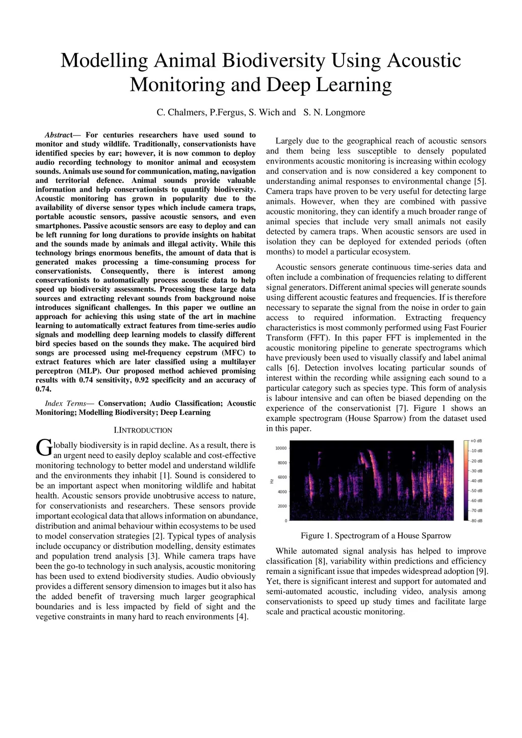 For centuries researchers have used sound to monitor and study wildlife. Traditionally, conservationists have identified species by ear; however, it is now common to deploy audio recording technology to monitor animal and ecosystem sounds. Animals use sound for communication, mating, navigation and territorial defence. Animal sounds provide valuable information and help conservationists to quantify biodiversity. Acoustic monitoring has grown in popularity due to the availability of diverse sensor types which include camera traps, portable acoustic sensors, passive acoustic sensors, and even smartphones. Passive acoustic sensors are easy to deploy and can be left running for long durations to provide insights on habitat and the sounds made by animals and illegal activity. While this technology brings enormous benefits, the amount of data that is generated makes processing a time-consuming process for conservationists. Consequently, there is interest among conservationists to automatically process acoustic data to help speed up biodiversity assessments. Processing these large data sources and extracting relevant sounds from background noise introduces significant challenges. In this paper we outline an approach for achieving this using state of the art in machine learning to automatically extract features from time-series audio signals and modelling deep learning models to classify different bird species based on the sounds they make. The acquired bird songs are processed using mel-frequency cepstrum (MFC) to extract features which are later classified using a multilayer perceptron (MLP). Our proposed method achieved promising results with 0.74 sensitivity, 0.92 specificity and an accuracy of 0.74.