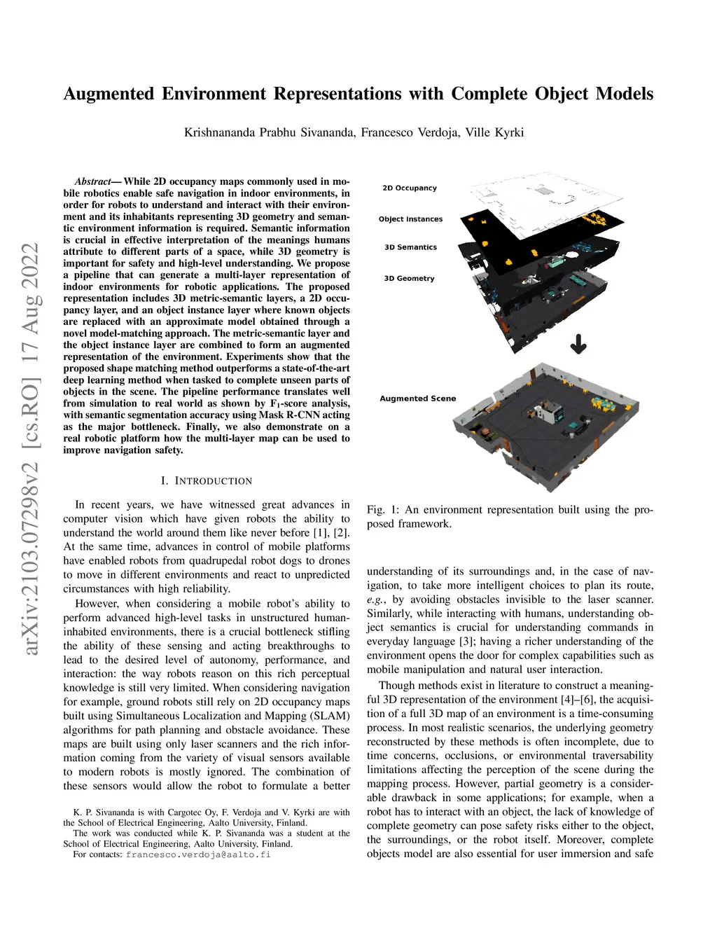 While 2D occupancy maps commonly used in mobile robotics enable safe navigation in indoor environments, in order for robots to understand and interact with their environment and its inhabitants representing 3D geometry and semantic environment information is required. Semantic information is crucial in effective interpretation of the meanings humans attribute to different parts of a space, while 3D geometry is important for safety and high-level understanding. We propose a pipeline that can generate a multi-layer representation of indoor environments for robotic applications. The proposed representation includes 3D metric-semantic layers, a 2D occupancy layer, and an object instance layer where known objects are replaced with an approximate model obtained through a novel model-matching approach. The metric-semantic layer and the object instance layer are combined to form an augmented representation of the environment. Experiments show that the proposed shape matching method outperforms a state-of-the-art deep learning method when tasked to complete unseen parts of objects in the scene. The pipeline performance translates well from simulation to real world as shown by F1-score analysis, with semantic segmentation accuracy using Mask R-CNN acting as the major bottleneck. Finally, we also demonstrate on a real robotic platform how the multi-layer map can be used to improve navigation safety.