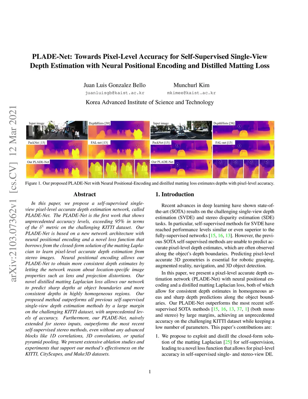 In this paper, we propose a self-supervised single-view pixel-level accurate depth estimation network, called PLADE-Net. The PLADE-Net is the first work that shows unprecedented accuracy levels, exceeding 95\% in terms of the metric on the challenging KITTI dataset. Our PLADE-Net is based on a new network architecture with neural positional encoding and a novel loss function that borrows from the closed-form solution of the matting Laplacian to learn pixel-level accurate depth estimation from stereo images. Neural positional encoding allows our PLADE-Net to obtain more consistent depth estimates by letting the network reason about location-specific image properties such as lens and projection distortions. Our novel distilled matting Laplacian loss allows our network to predict sharp depths at object boundaries and more consistent depths in highly homogeneous regions. Our proposed method outperforms all previous self-supervised single-view depth estimation methods by a large margin on the challenging KITTI dataset, with unprecedented levels of accuracy. Furthermore, our PLADE-Net, naively extended for stereo inputs, outperforms the most recent self-supervised stereo methods, even without any advanced blocks like 1D correlations, 3D convolutions, or spatial pyramid pooling. We present extensive ablation studies and experiments that support our method's effectiveness on the KITTI, CityScapes, and Make3D datasets.