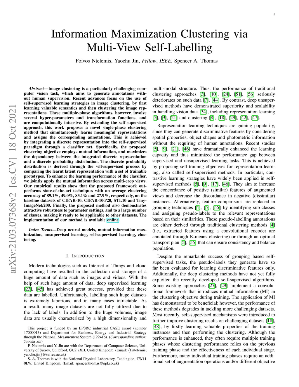 Image clustering is a particularly challenging computer vision task, which aims to generate annotations without human supervision. Recent advances focus on the use of self-supervised learning strategies in image clustering, by first learning valuable semantics and then clustering the image representations. These multiple-phase algorithms, however, increase the computational time and their final performance is reliant on the first stage. By extending the self-supervised approach, we propose a novel single-phase clustering method that simultaneously learns meaningful representations and assigns the corresponding annotations. This is achieved by integrating a discrete representation into the self-supervised paradigm through a classifier net. Specifically, the proposed clustering objective employs mutual information, and maximizes the dependency between the integrated discrete representation and a discrete probability distribution. The discrete probability distribution is derived though the self-supervised process by comparing the learnt latent representation with a set of trainable prototypes. To enhance the learning performance of the classifier, we jointly apply the mutual information across multi-crop views. Our empirical results show that the proposed framework outperforms state-of-the-art techniques with the average accuracy of 89.1% and 49.0%, respectively, on CIFAR-10 and CIFAR-100/20 datasets. Finally, the proposed method also demonstrates attractive robustness to parameter settings, making it ready to be applicable to other datasets.