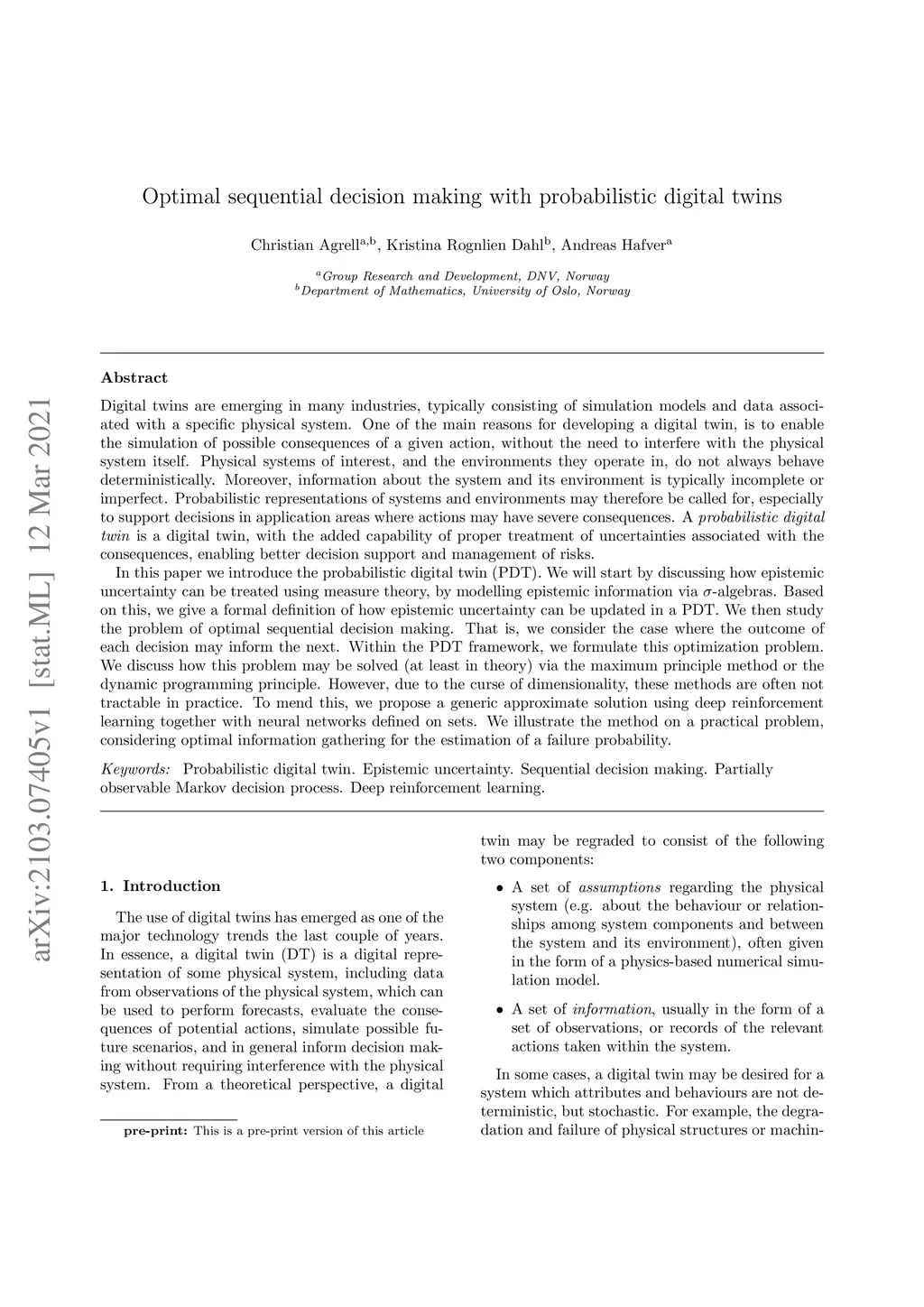 Digital twins are emerging in many industries, typically consisting of simulation models and data associated with a specific physical system. One of the main reasons for developing a digital twin, is to enable the simulation of possible consequences of a given action, without the need to interfere with the physical system itself. Physical systems of interest, and the environments they operate in, do not always behave deterministically. Moreover, information about the system and its environment is typically incomplete or imperfect. Probabilistic representations of systems and environments may therefore be called for, especially to support decisions in application areas where actions may have severe consequences. In this paper we introduce the probabilistic digital twin (PDT). We will start by discussing how epistemic uncertainty can be treated using measure theory, by modelling epistemic information via -algebras. Based on this, we give a formal definition of how epistemic uncertainty can be updated in a PDT. We then study the problem of optimal sequential decision making. That is, we consider the case where the outcome of each decision may inform the next. Within the PDT framework, we formulate this optimization problem. We discuss how this problem may be solved (at least in theory) via the maximum principle method or the dynamic programming principle. However, due to the curse of dimensionality, these methods are often not tractable in practice. To mend this, we propose a generic approximate solution using deep reinforcement learning together with neural networks defined on sets. We illustrate the method on a practical problem, considering optimal information gathering for the estimation of a failure probability.